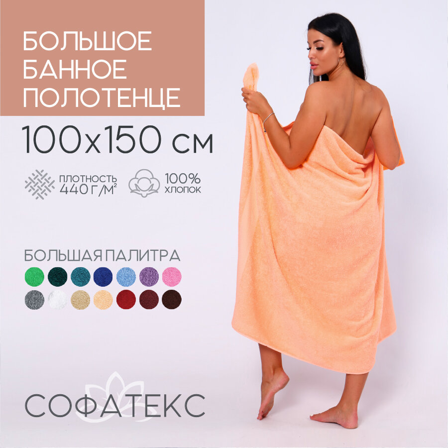 Купить Полотенце банное махровое 100% хлопок Софатекс 100х150 для ванны и душа, цвет персик