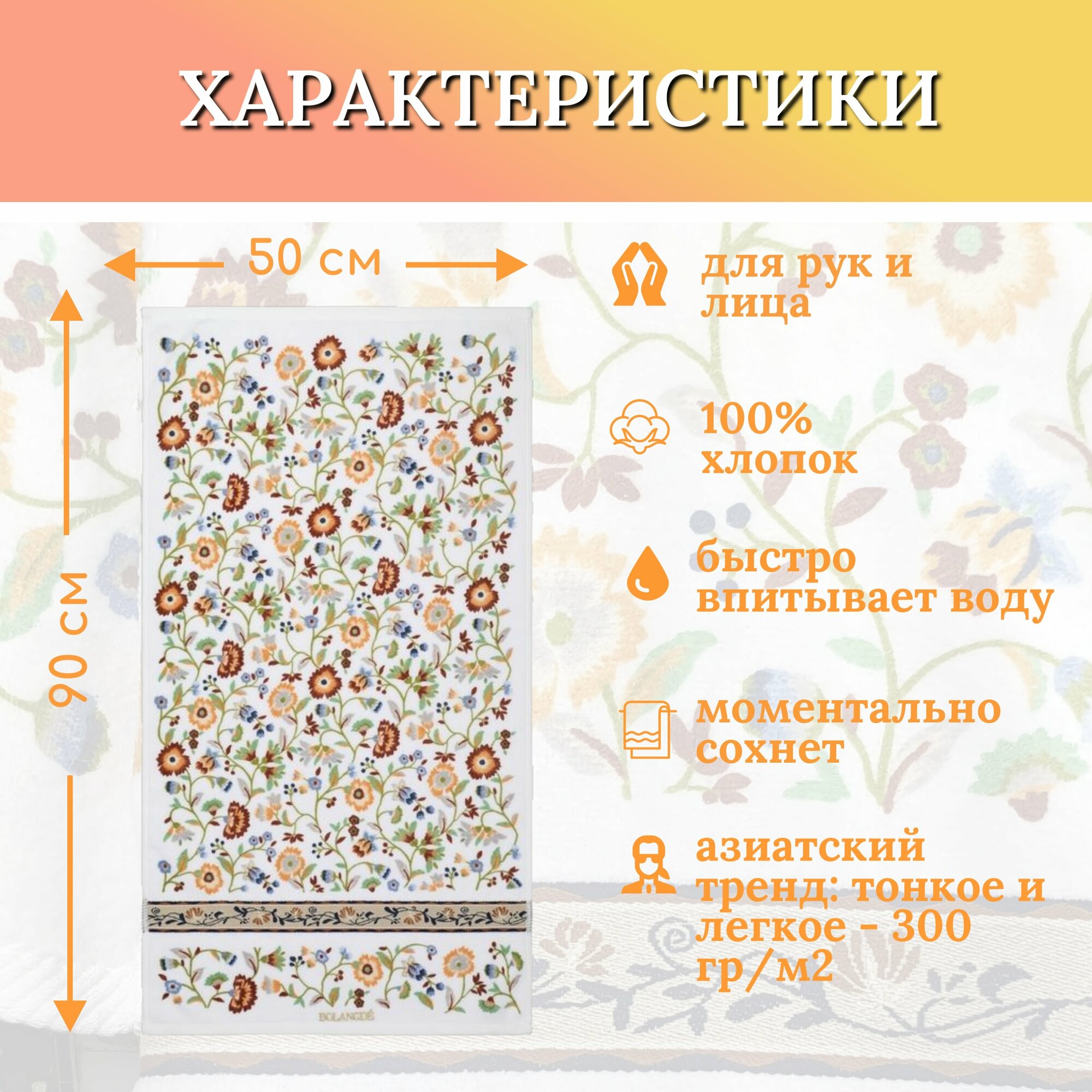 Купить Полотенце для ванной махровое, для лица и рук, велюровое BOLANGDE, 100% хлопок, рисунок цветы, Япония Васильки 50х90, белый/оранжевый/зеленый 1 шт