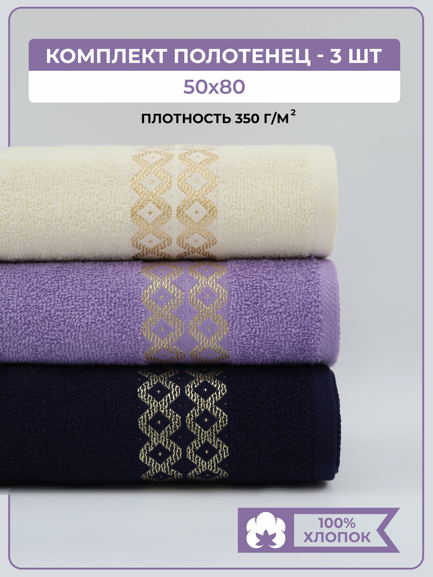 Купить Набор № 2619 махровых полотенец Крем+темно-синий+сирень 3 шт (50x80 3 шт)
