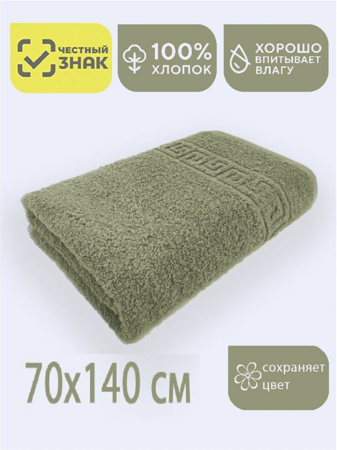 Полотенце банное махровое салатовый с греческим бардюром 70х140 см / Плотность 430 гр/м2 / 100% хлопок / Подарок / Ашхабадский текстильный комплекс