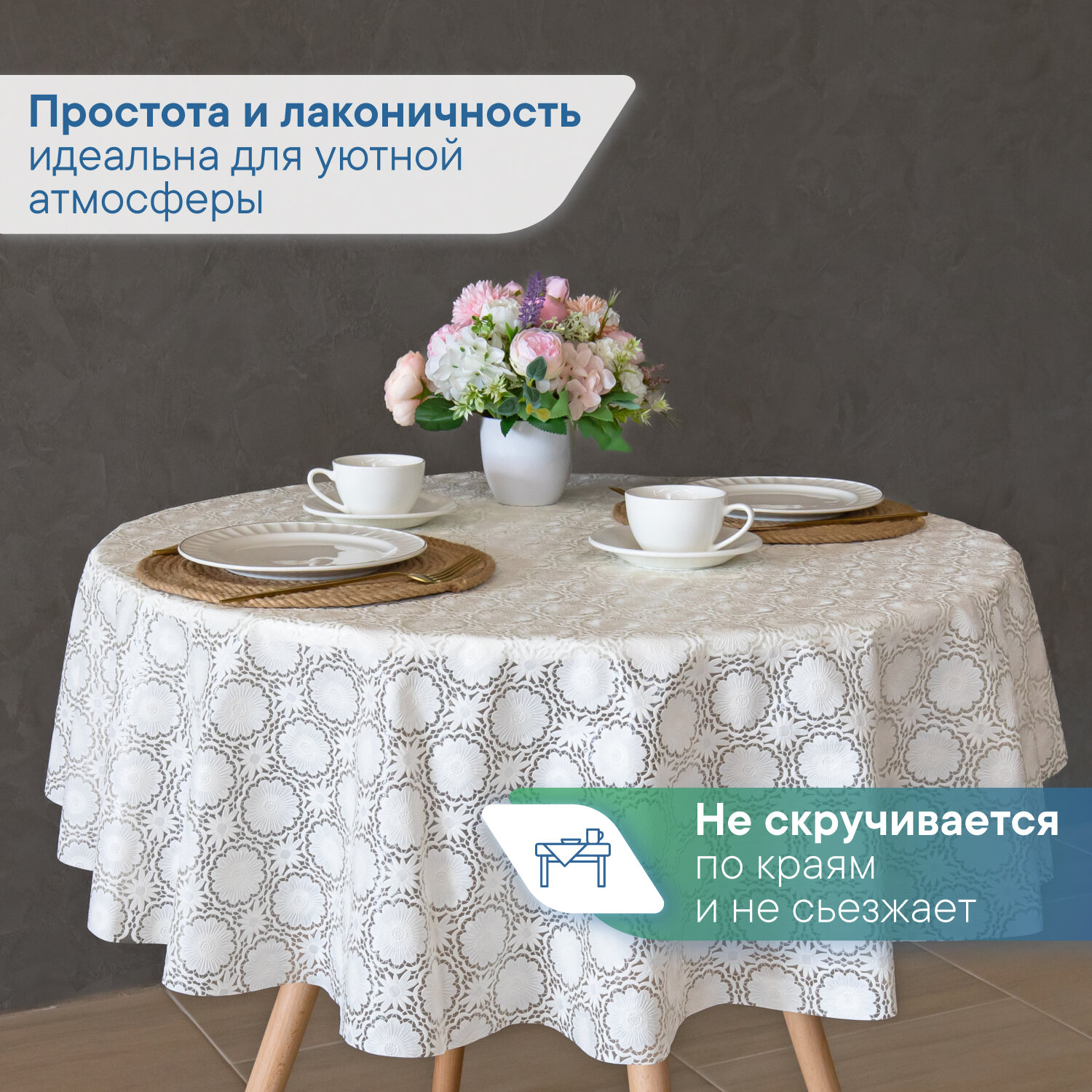 Скатерть круглая клеенка на стол ПВХ VILINA "Элегия" диаметр 128 см. водонепроницаемая с узором / скатерть праздничная белая 016-grey