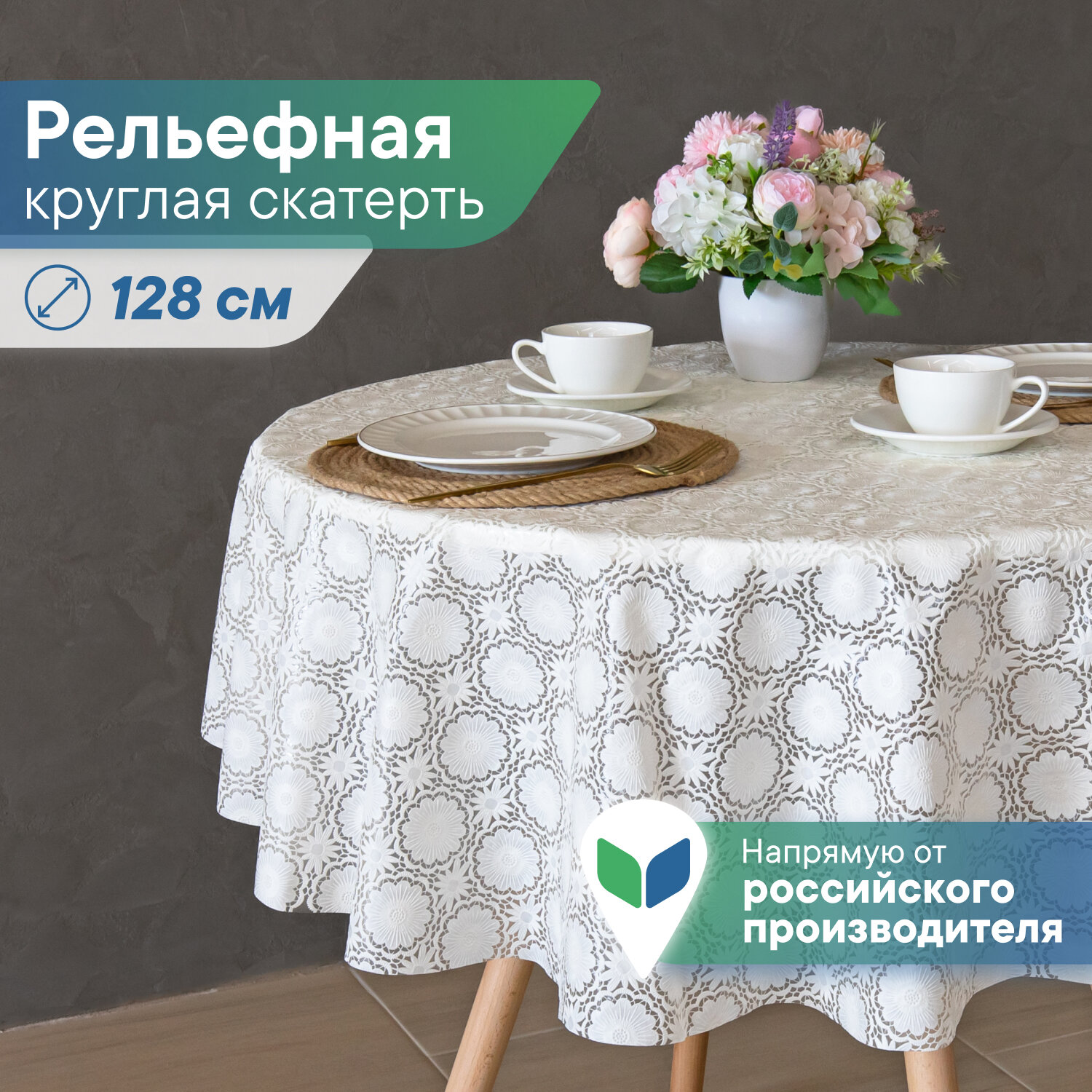 Скатерть круглая клеенка на стол ПВХ VILINA "Элегия" диаметр 128 см. водонепроницаемая с узором / скатерть праздничная белая 001-white