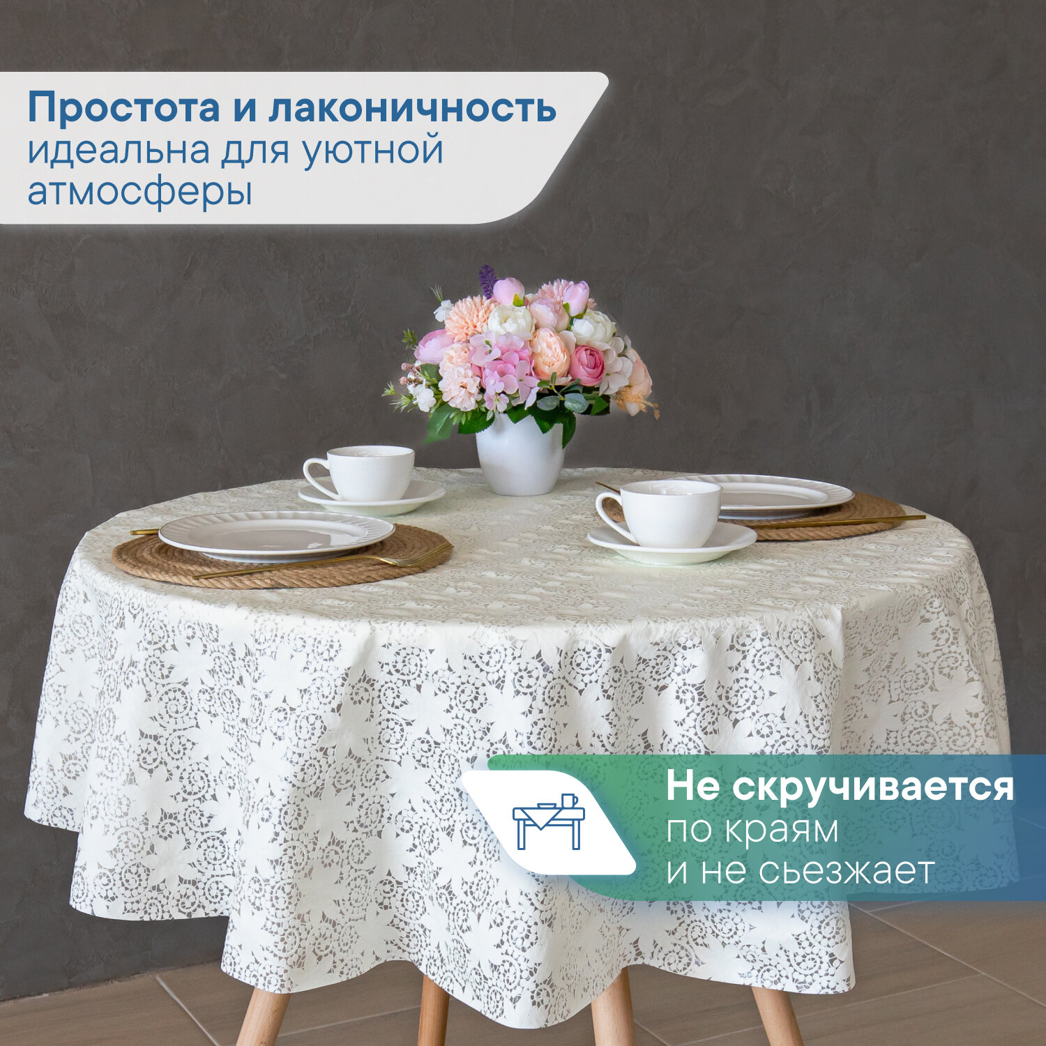Скатерть круглая клеенка на стол ПВХ VILINA "Элегия" диаметр 128 см. водонепроницаемая с узором / скатерть праздничная белая 016-grey