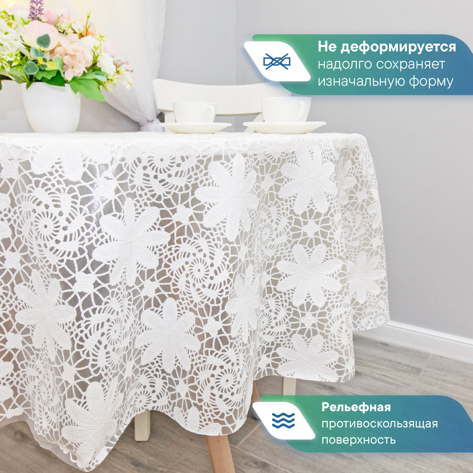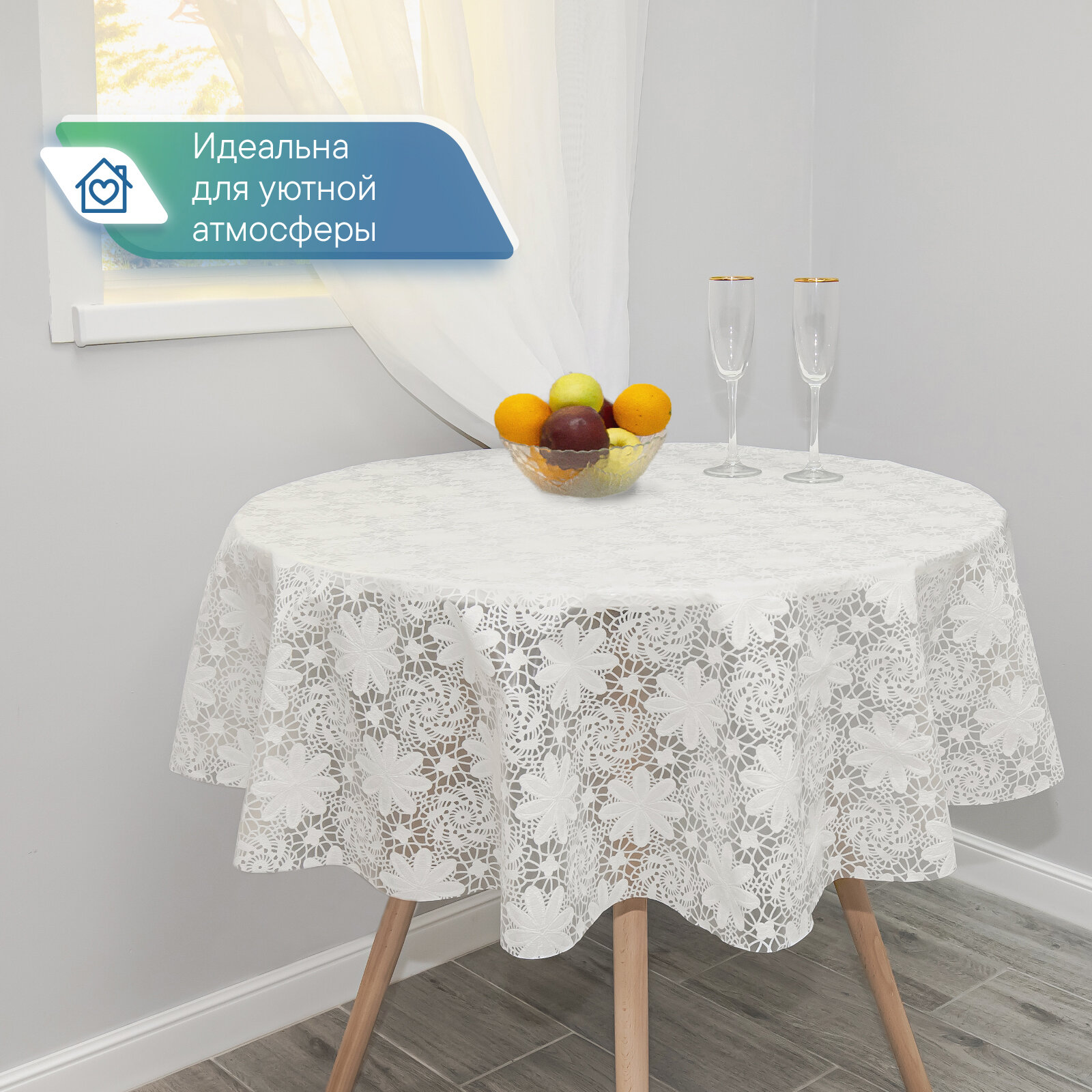 Скатерть круглая клеенка на стол ПВХ VILINA "Элегия" диаметр 128 см. водонепроницаемая с узором / скатерть праздничная белая 005-white