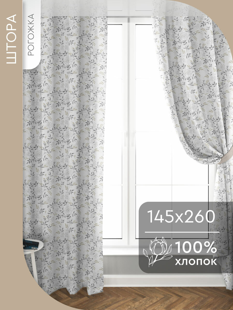 Штора кухонная 145х260 см, Рогожка, 100% хлопок, Тесьма, Цветение