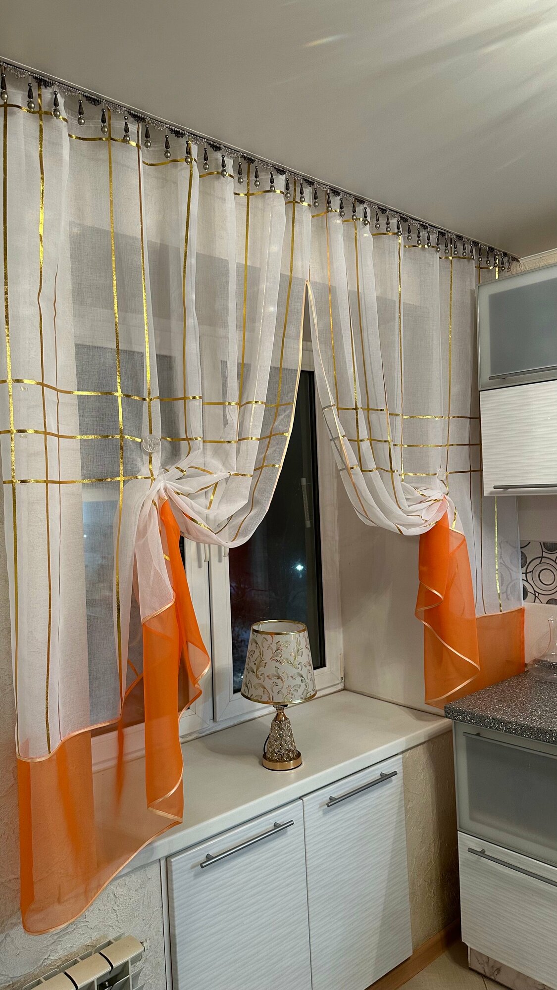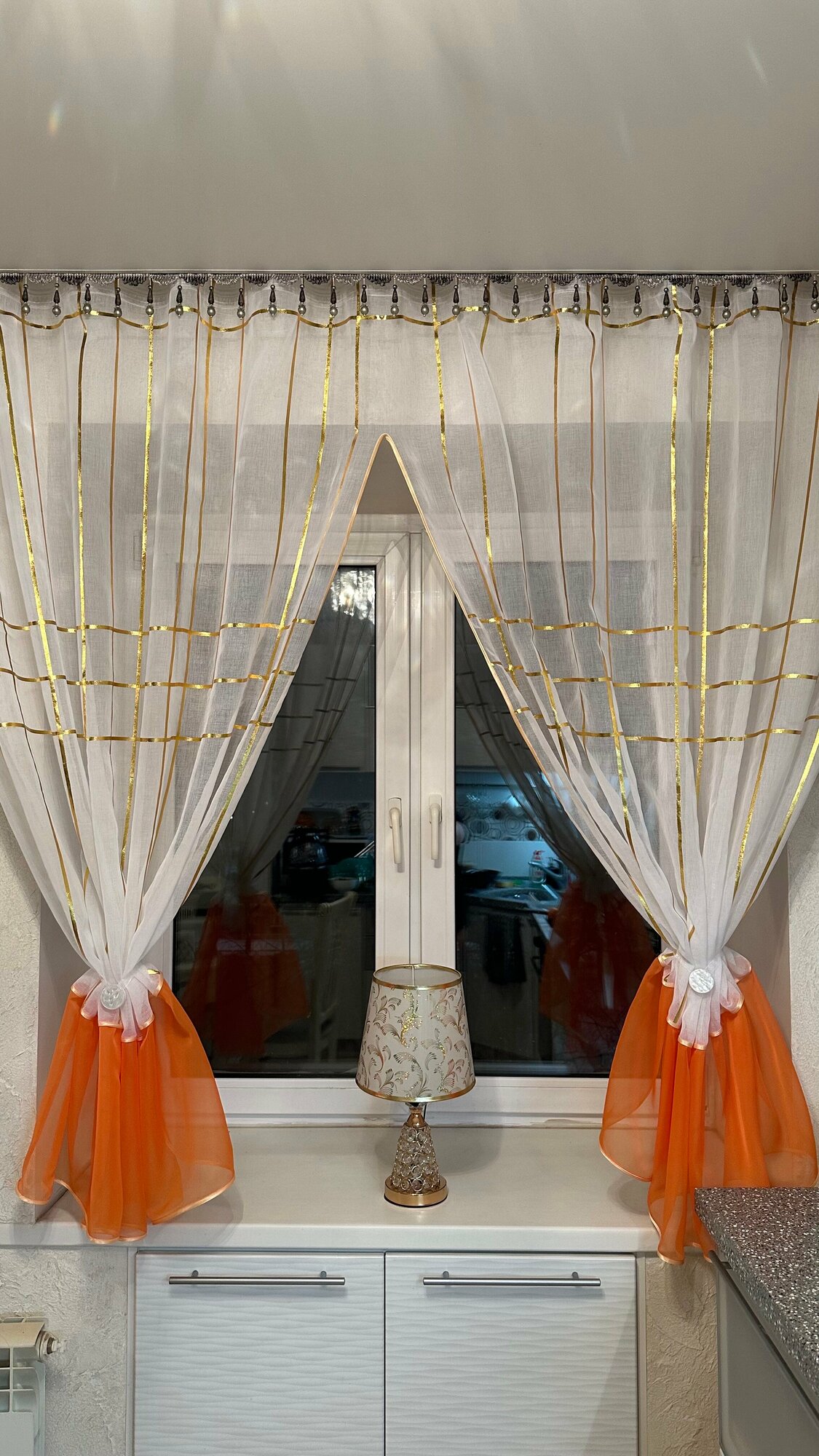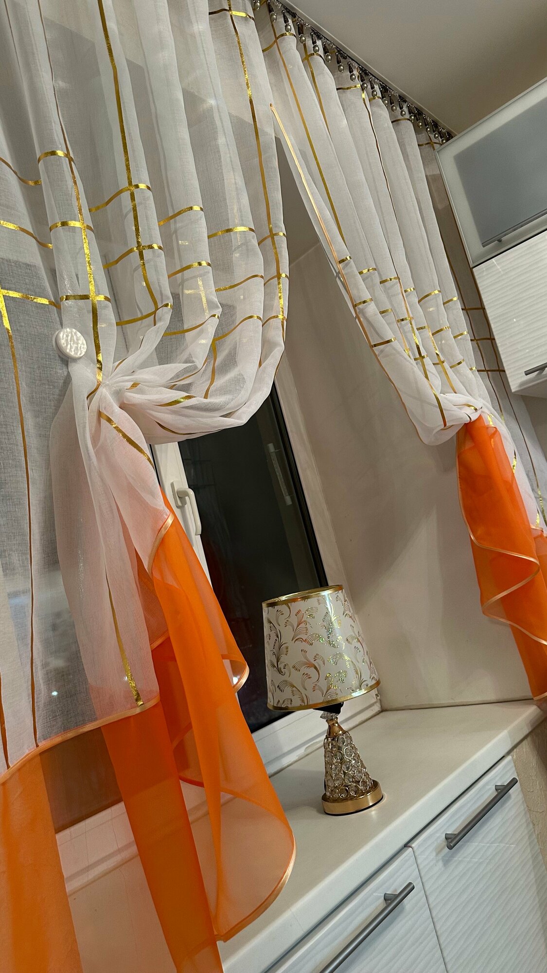 СохранитьКухонная шторка льняная с золотом и оранжевой вставкой, ширина 3м, высота 1,7м интересное: