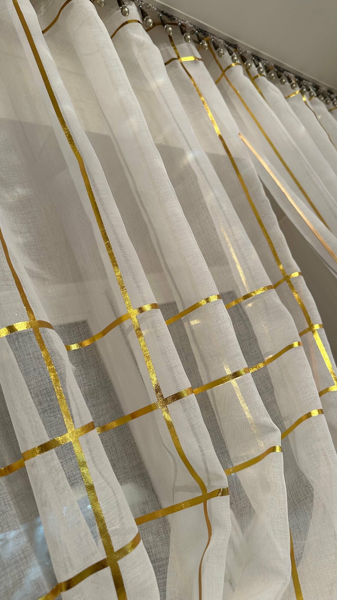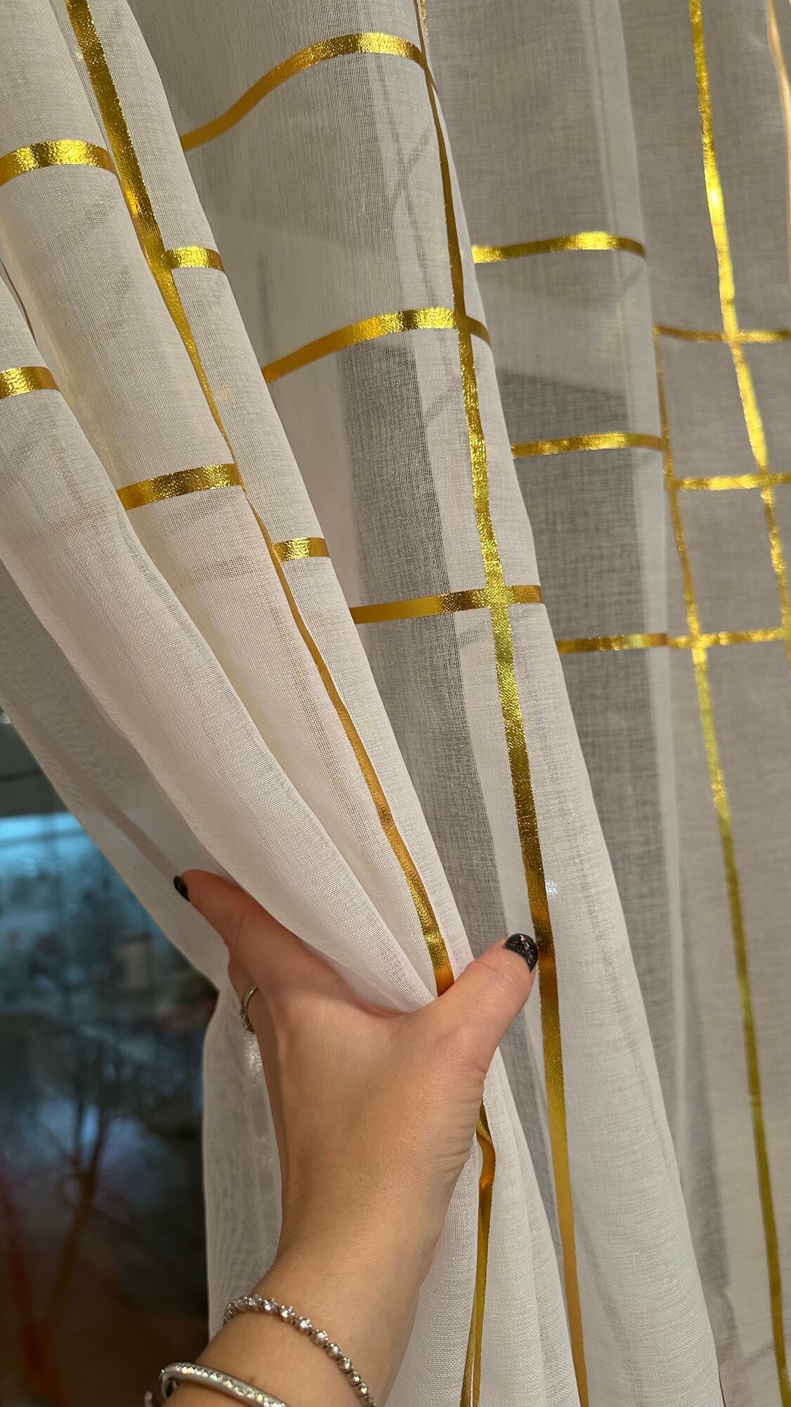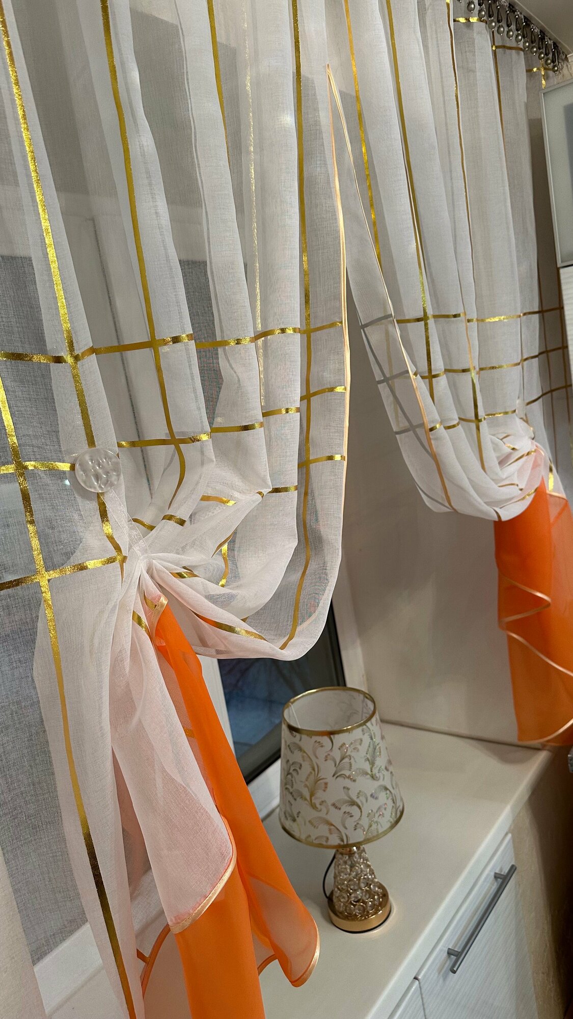 СохранитьКухонная шторка льняная с золотом и оранжевой вставкой, ширина 3м, высота 1,7м интересное: