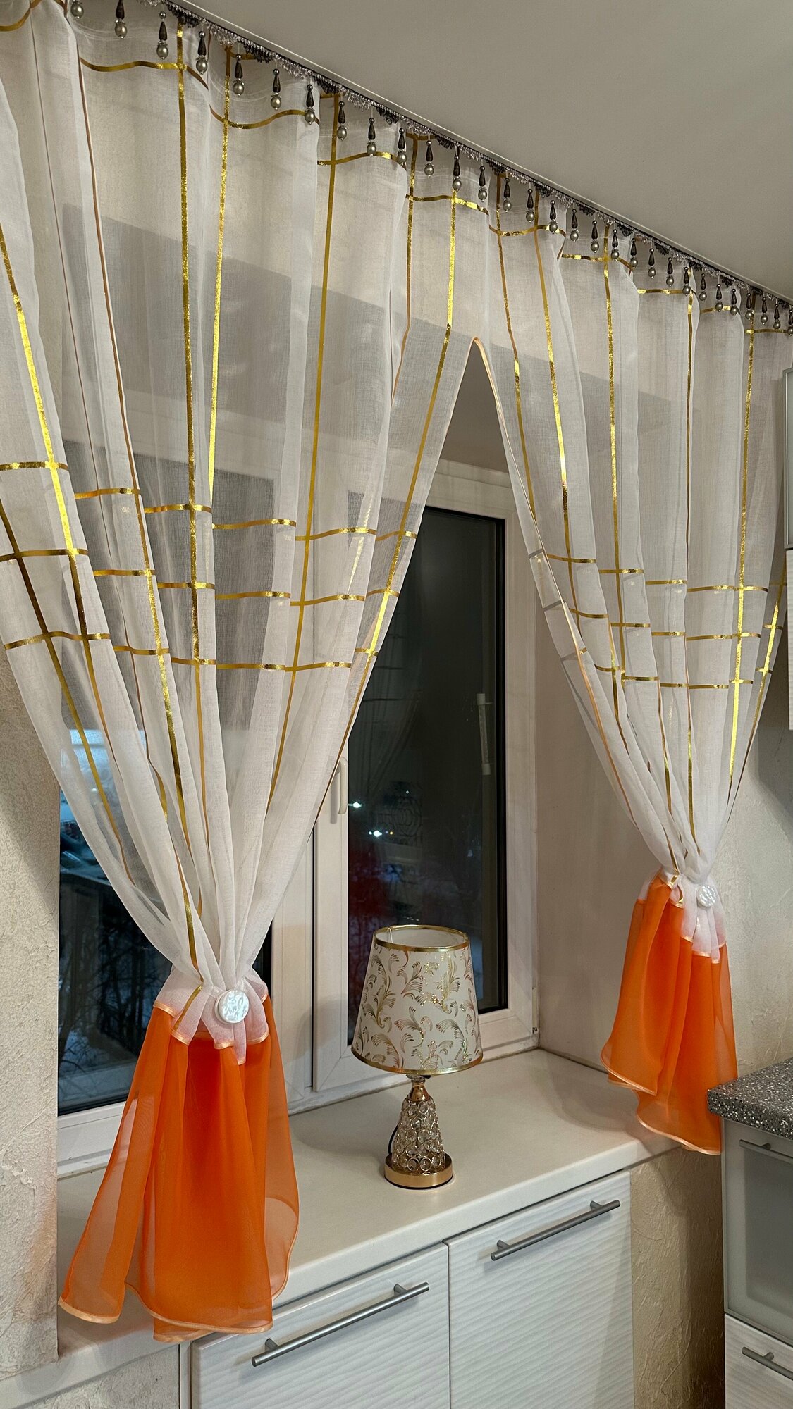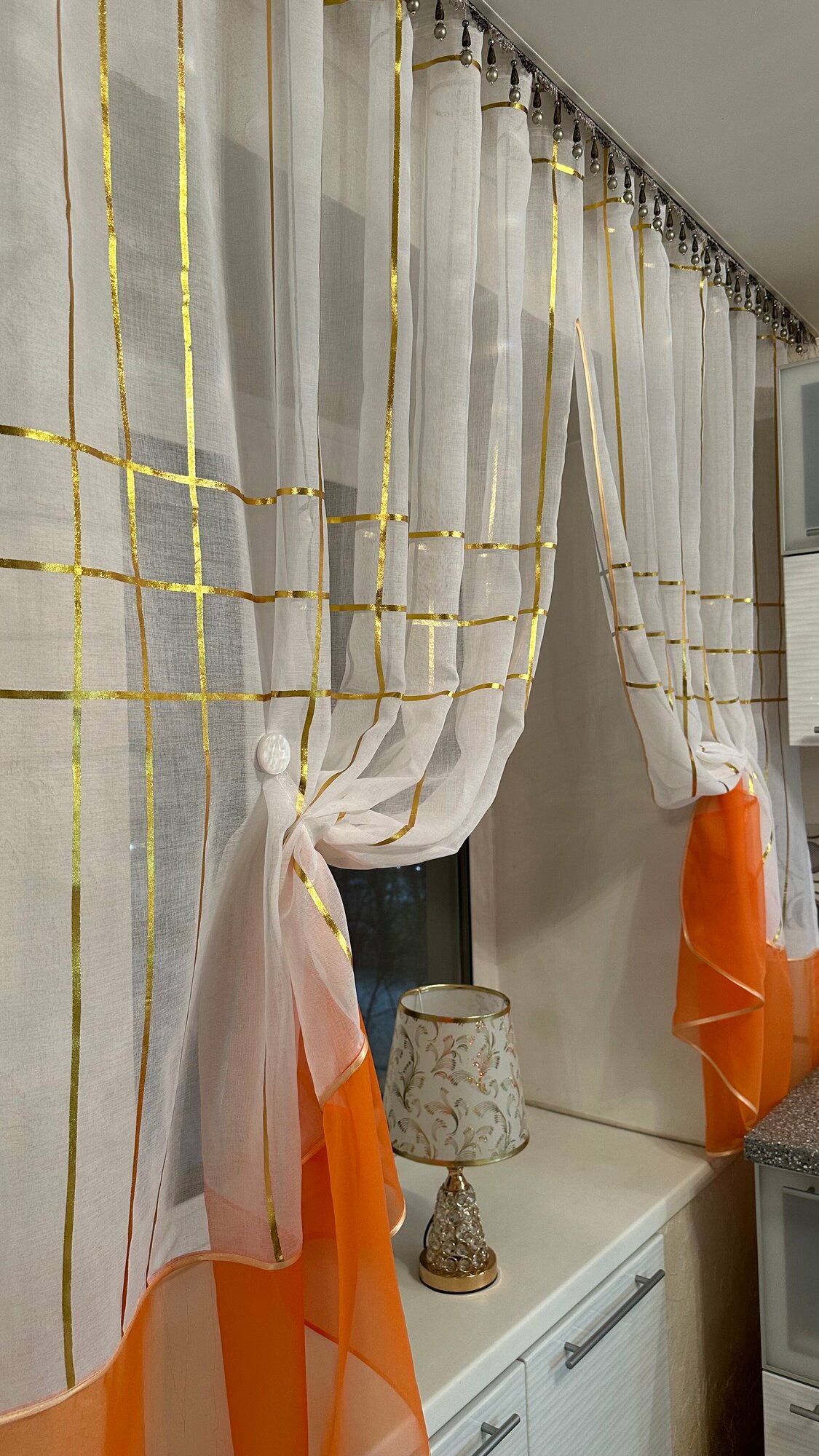 Купить Кухонная шторка льняная с золотом и оранжевой вставкой, ширина 3м, высота 1,7м