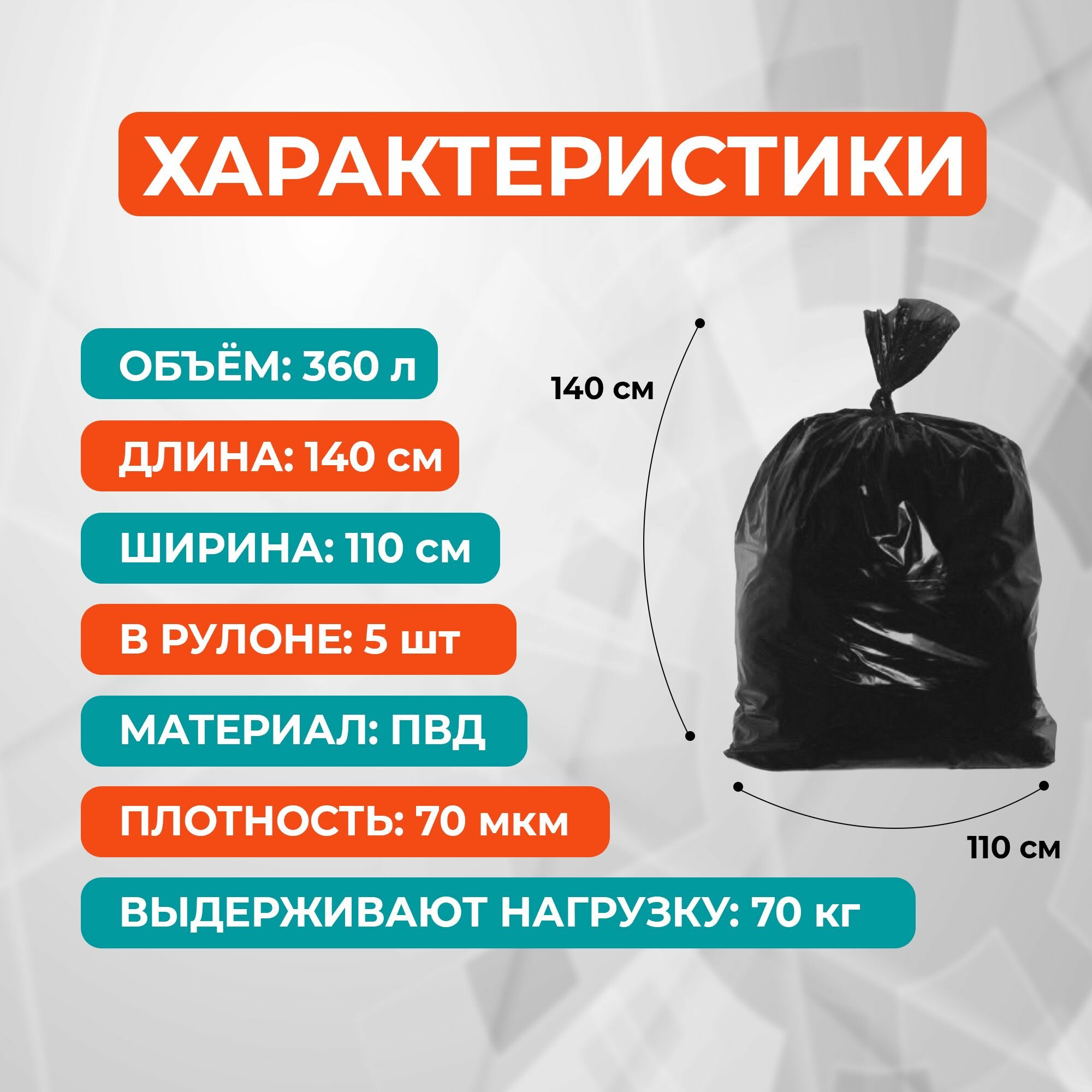 | Дополнительная информация | Мешки для строительного мусора 360 литров Стройка плотные черные, 2 слоя (ПВД, 70 мкм, в рулоне 5 штук, 110x140 см) |