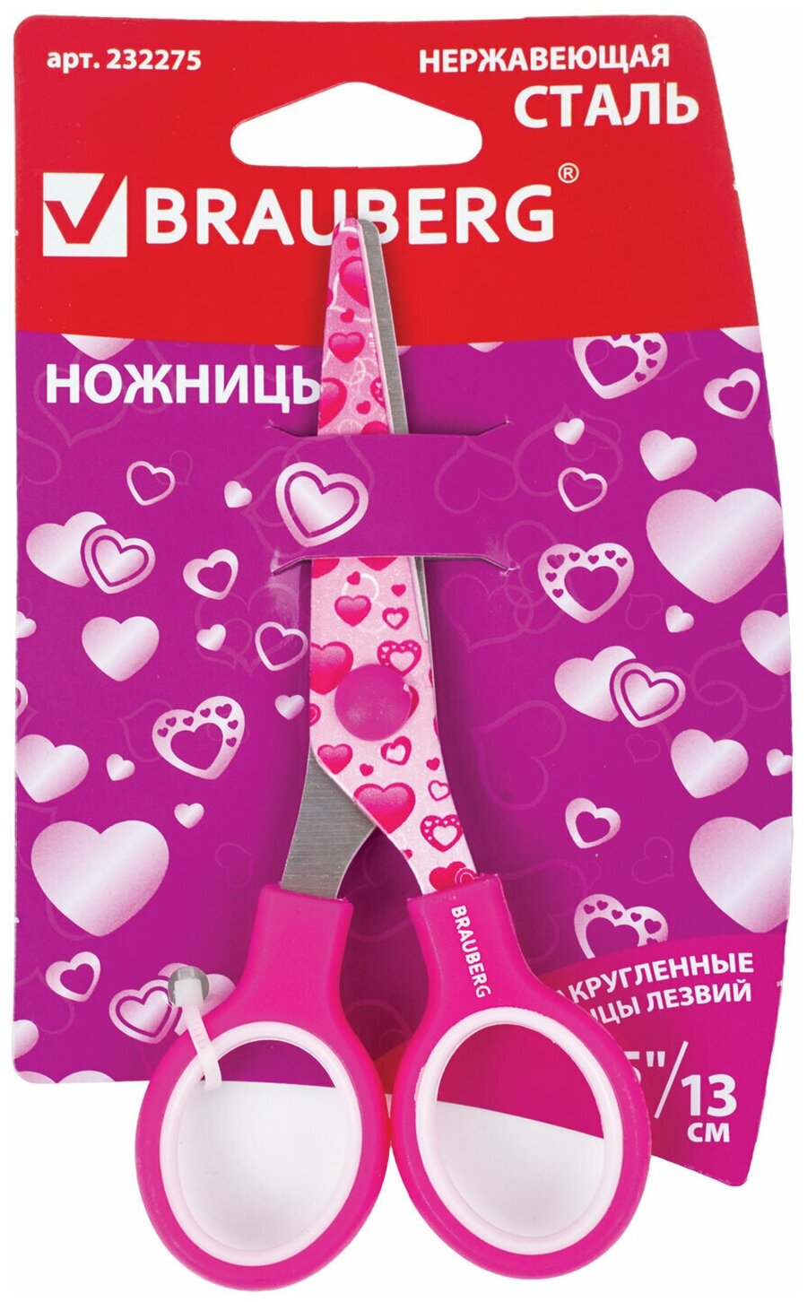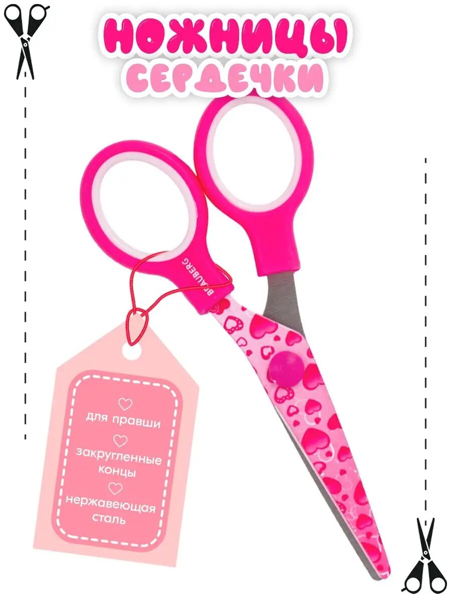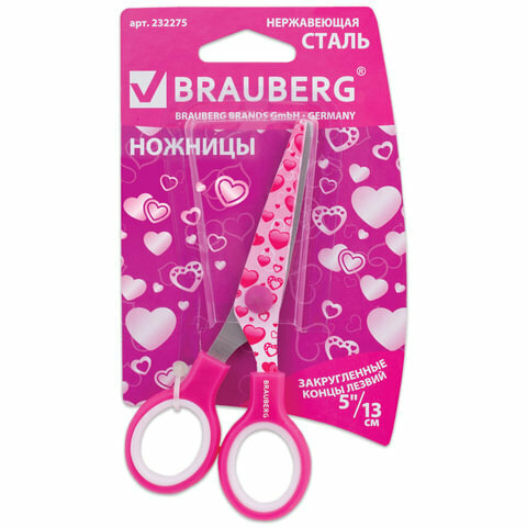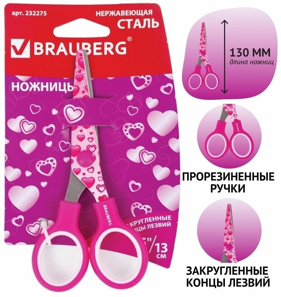 Ножницы канцелярские универсальные для бумаги и картона Brauberg "Kid Series", с цветной печатью "Сердечки", 130 мм, малиновые интересное: