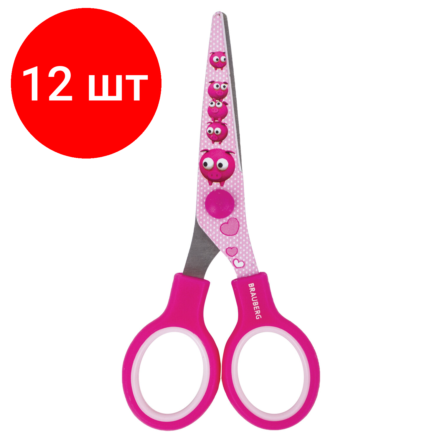 Купить Комплект 12 шт, Ножницы BRAUBERG "Kid Series", 130 мм, розовые, с цветной печатью "Поросята", закругленные, 232272