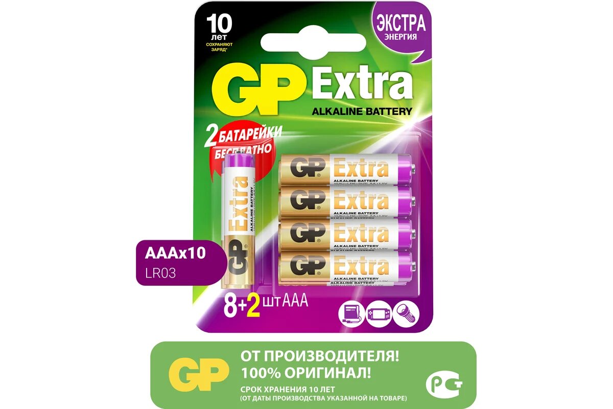 Купить Батарея GP Extra Alkaline AAA (LR03), 10 шт. 24AX8/2-CR10