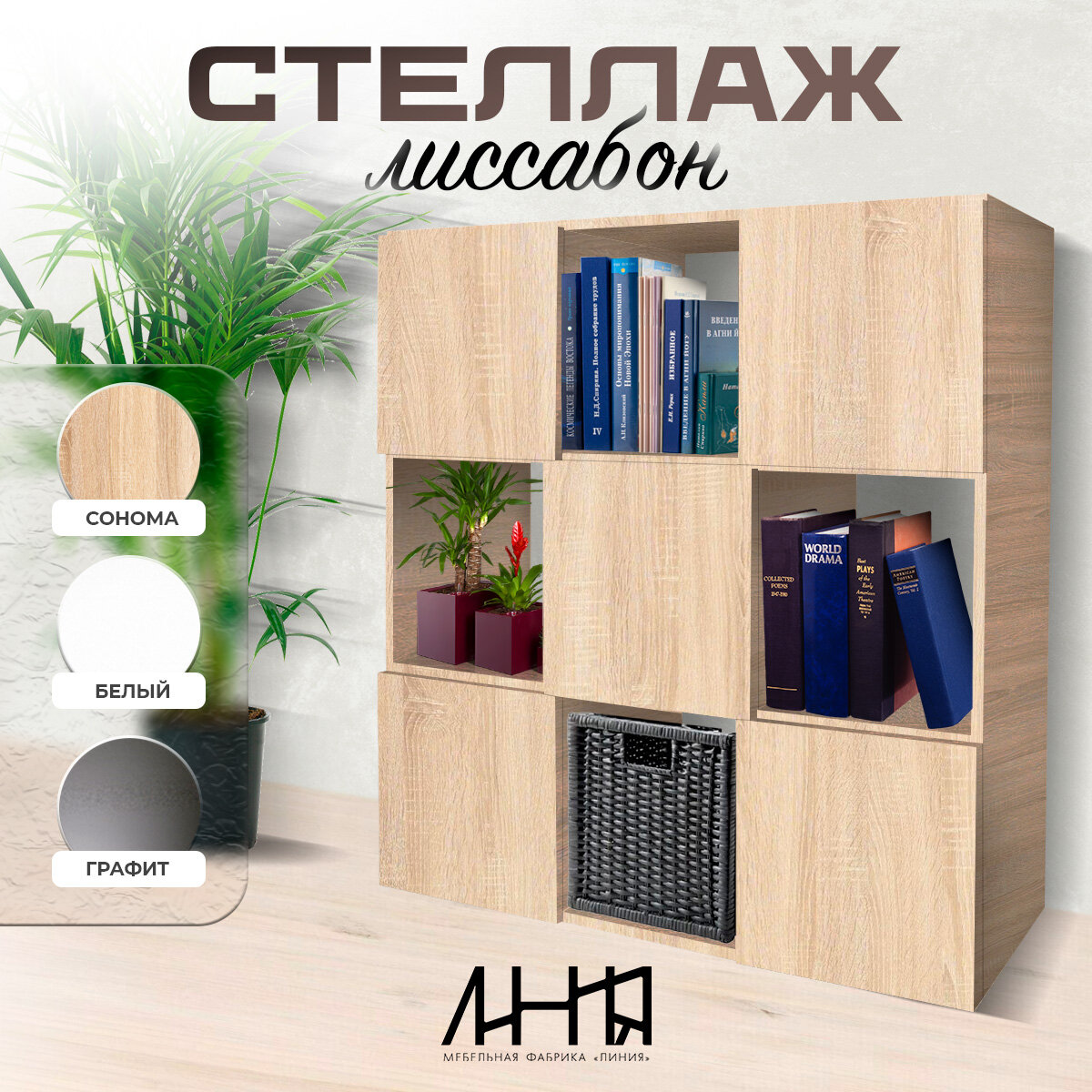Стеллаж деревянный напольный, сонома, 105.5х105.5х33 см, 9 полок, с дверками, "Лиссабон", мебельная фабрика "Линия" интересное: