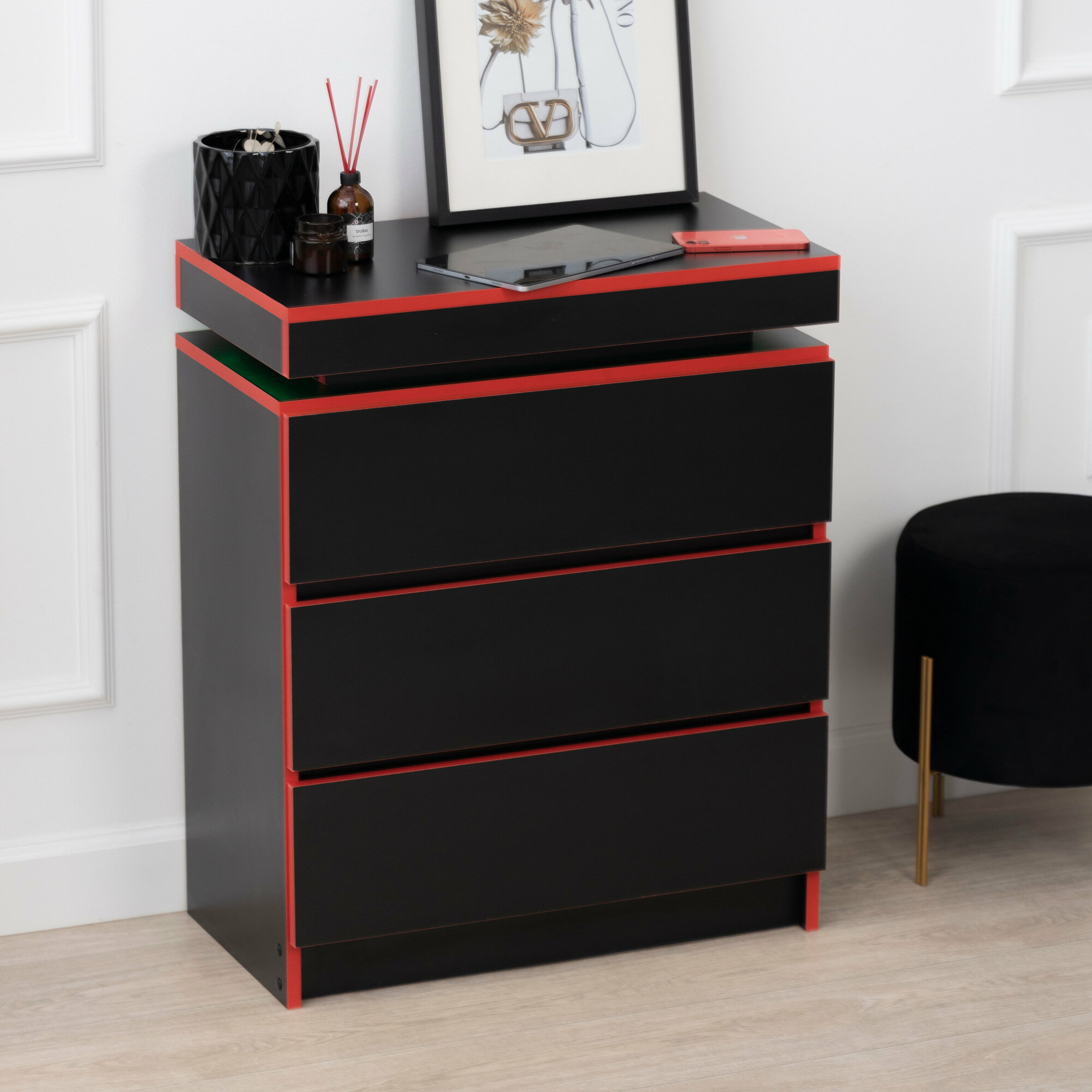 Комод с ящиками для хранения одежды, деревянный с подсветкой в стиле лофт, черный 65х35х80 см интересное: