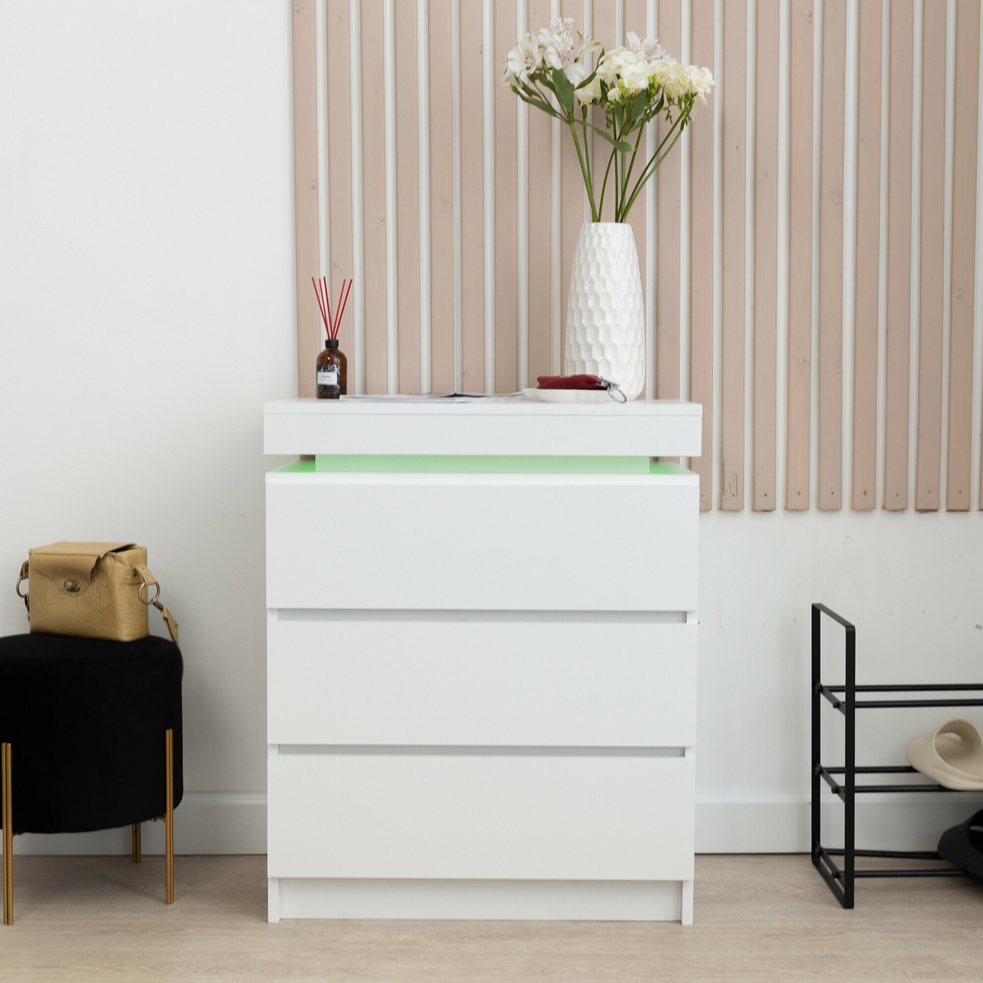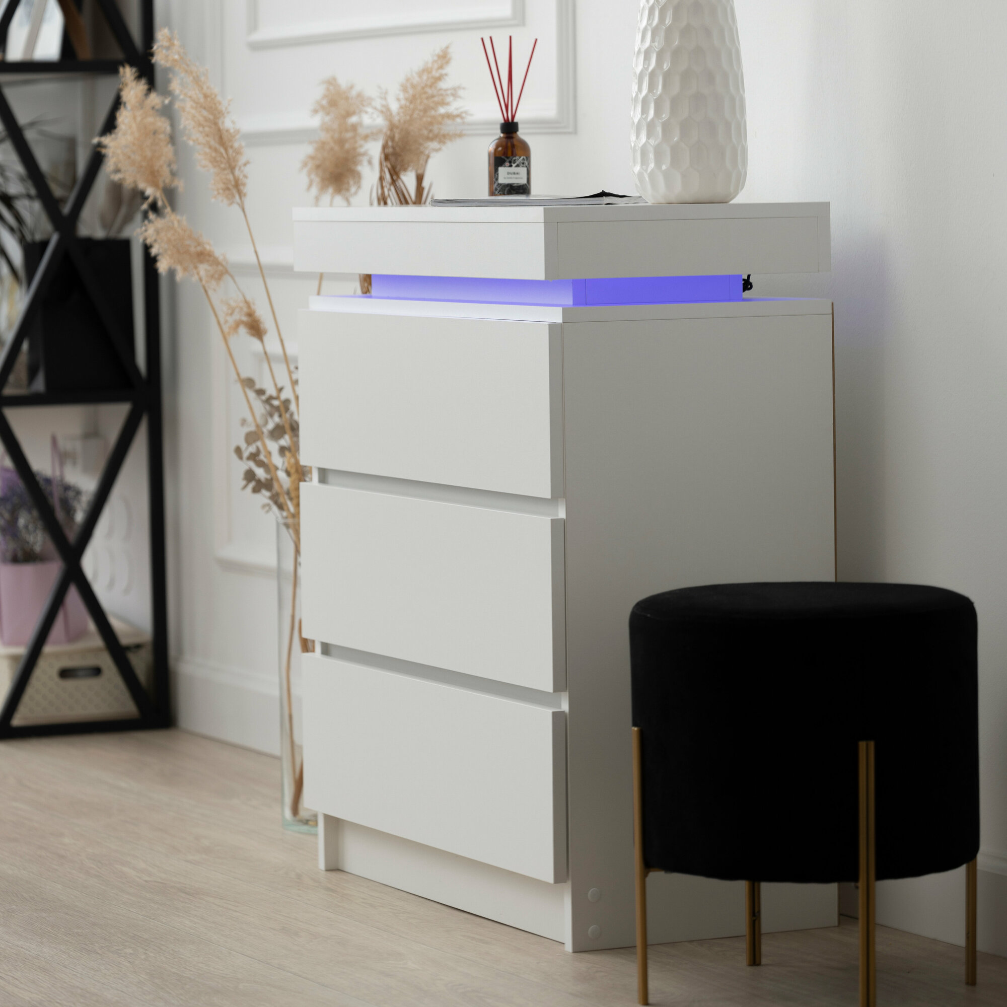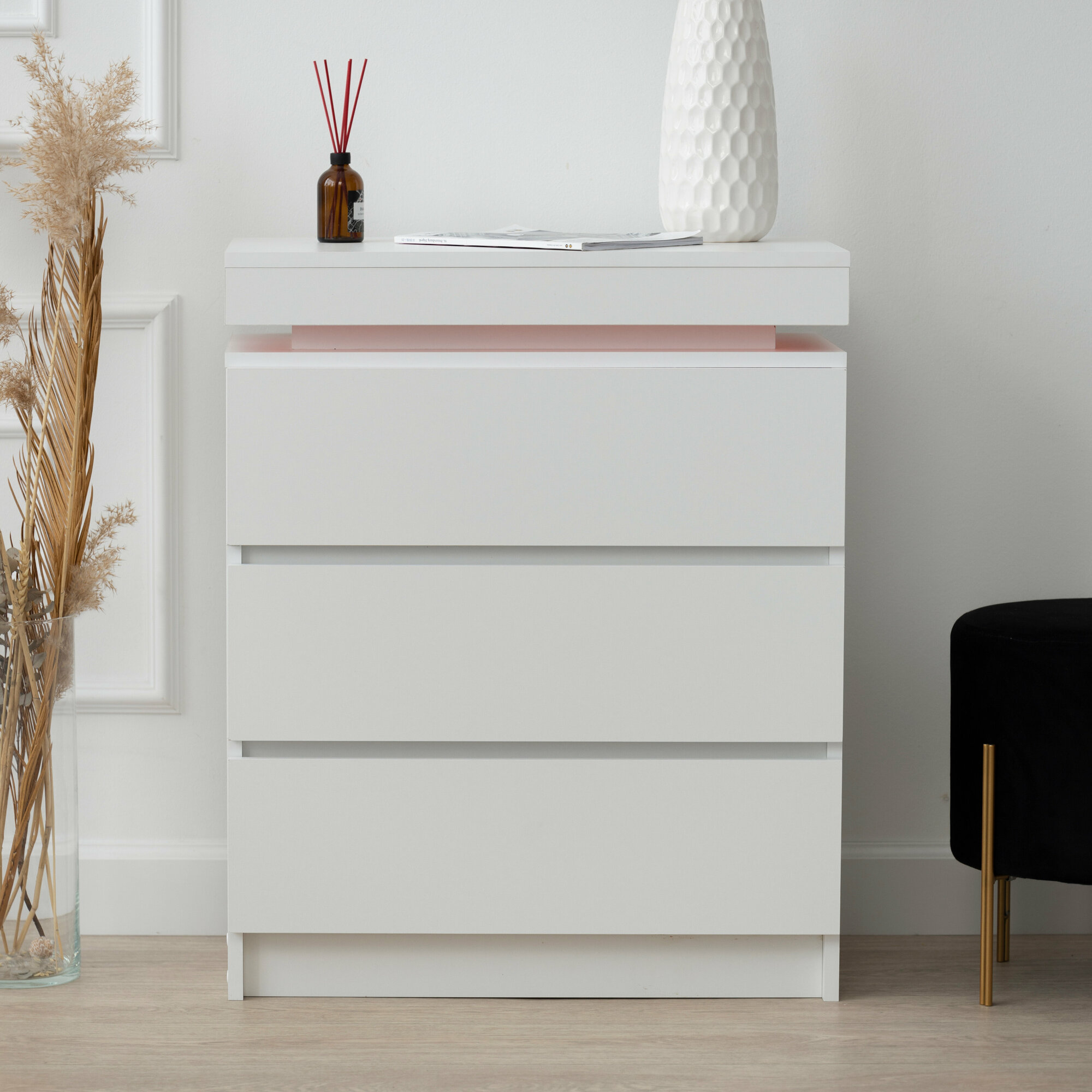 Комод с ящиками для хранения одежды, деревянный с подсветкой в стиле лофт, белый 65х35х80 см интересное: