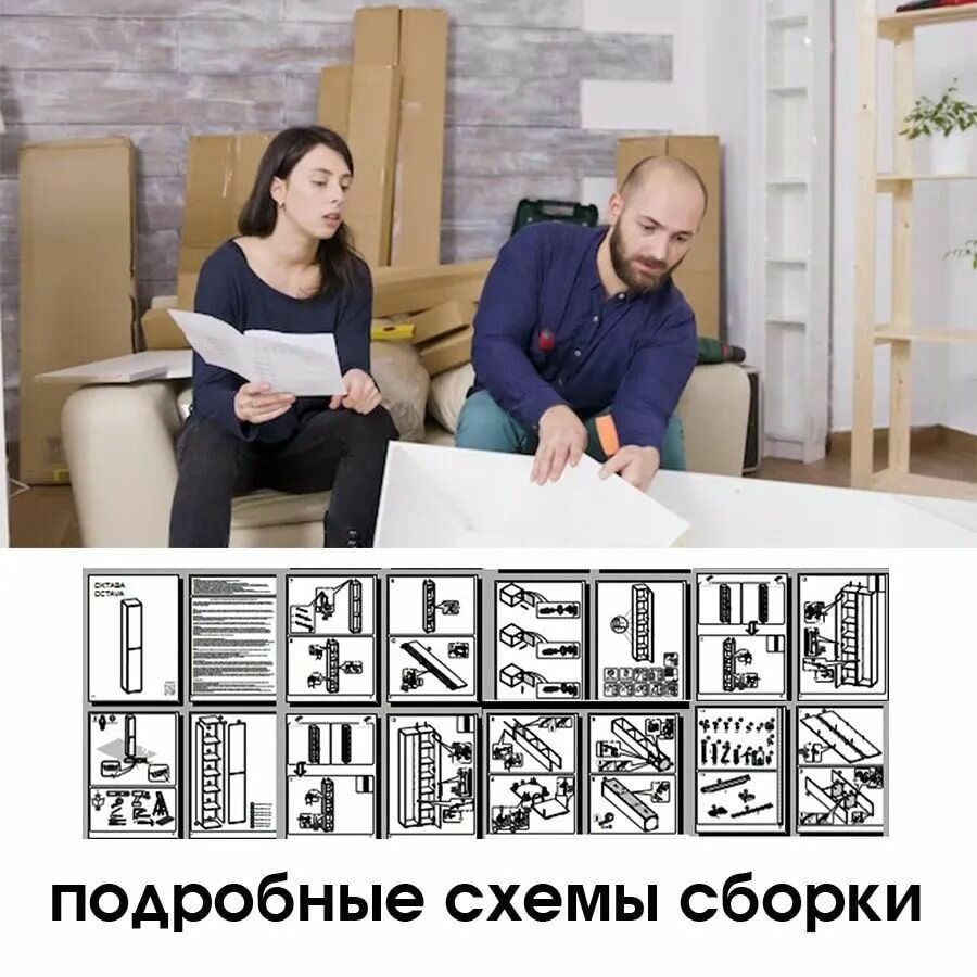 | Дополнительная информация | собирается на любую сторону, сторона открывания фасада определяется во время сборки, шкаф двойного назначения, распашной фасад на четырехшарнирных петлях с доводчиками, внутренняя часть шкафа разделена 6 полками на 7 секций (верхняя и нижняя полки фиксированные, между ними 4 съемные полки), поперечная штанга для вешалок под одежду, матовые металлические ручки - долгосрочность использования, пластиковые регулируемые опоры - простота регулировки при неровностях пола, надежная фурнитура - гарантия длительной эксплуатации, корпус ЛДСП 1,6 см, фасад МДФ 1,9 см, кромка ПВХ 0,4 и 2,0 мм, максимальная нагрузка на штангу для одежды до 4,5 кг (3 вешалки для одежды по 1,5 кг), максимальная нагрузка на каждую полку для хранения до 5 кг, во избежание опрокидывания и травмобезопасности предусмотрено крепление к стене (в комплекте) и межсекционная стяжка для крепления к соседнему модулю (в комплекте) |