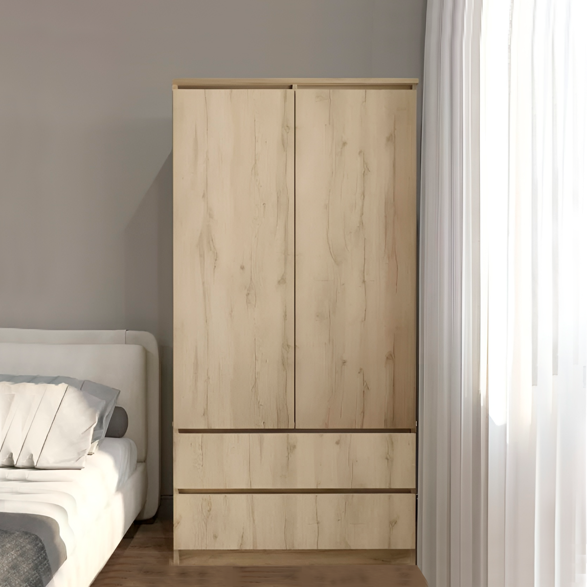 | Дополнительная информация | Шкаф выполнен из ЛДСП цвета дуб крафт. Ящики 2х дверного шкафа на роликовых направляющих. Центральная часть 2х дверного шкафа разделена на отделения: с одной стороны полки для белья, вторая половина -штанга для одежды, нижняя часть имеет 2 выдвижных ящика. Благодаря отсутствию лицевой фурнитуры шкаф универсален в использовании и впишется в любой интерьер -гостиной, детской, спальни, коридора. |