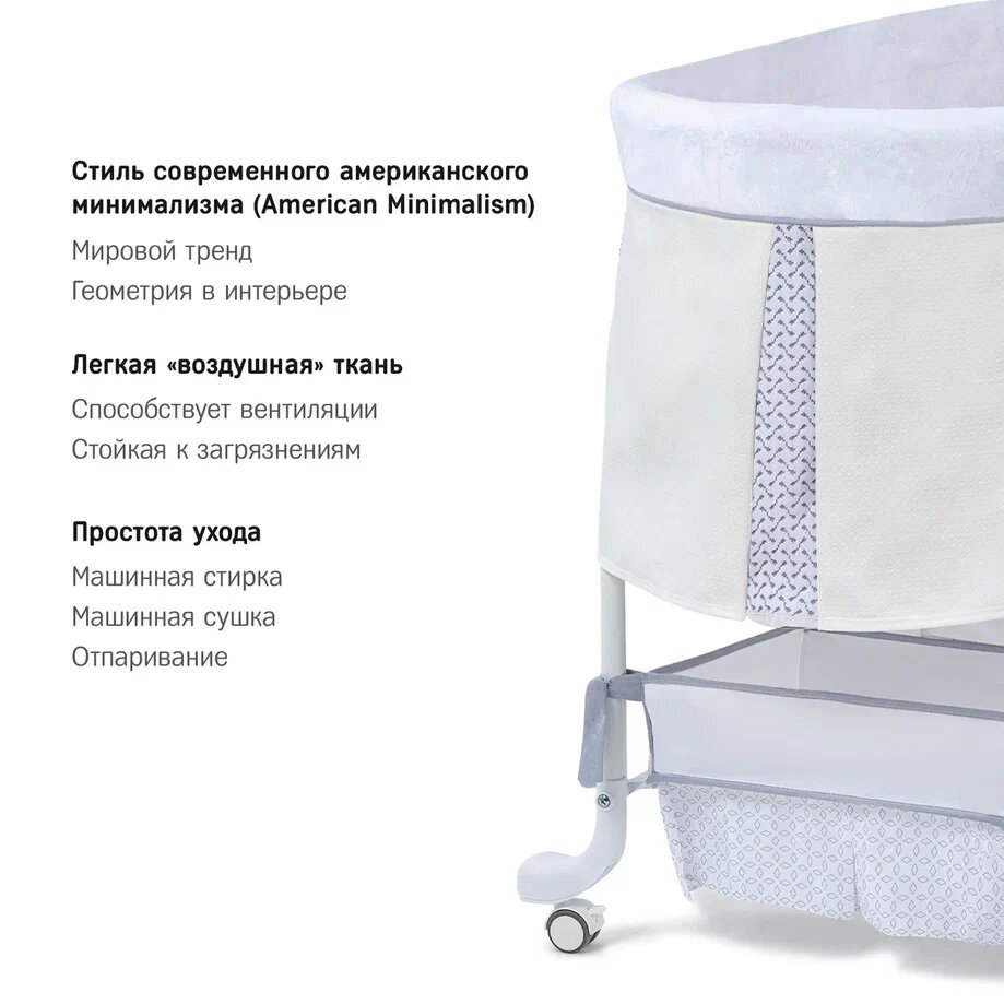 | Комплектация | колыбель / съёмный матрасик / наматрасник / капор / мобиль с игрушками / тканевая корзина для белья |