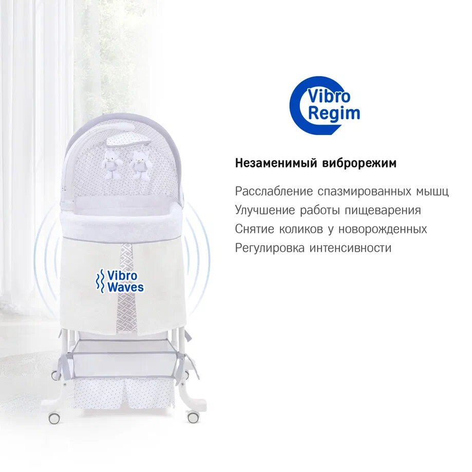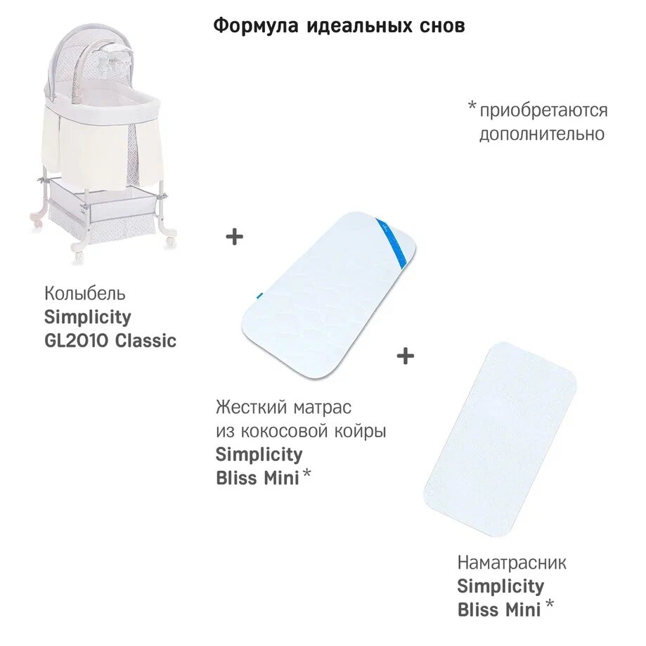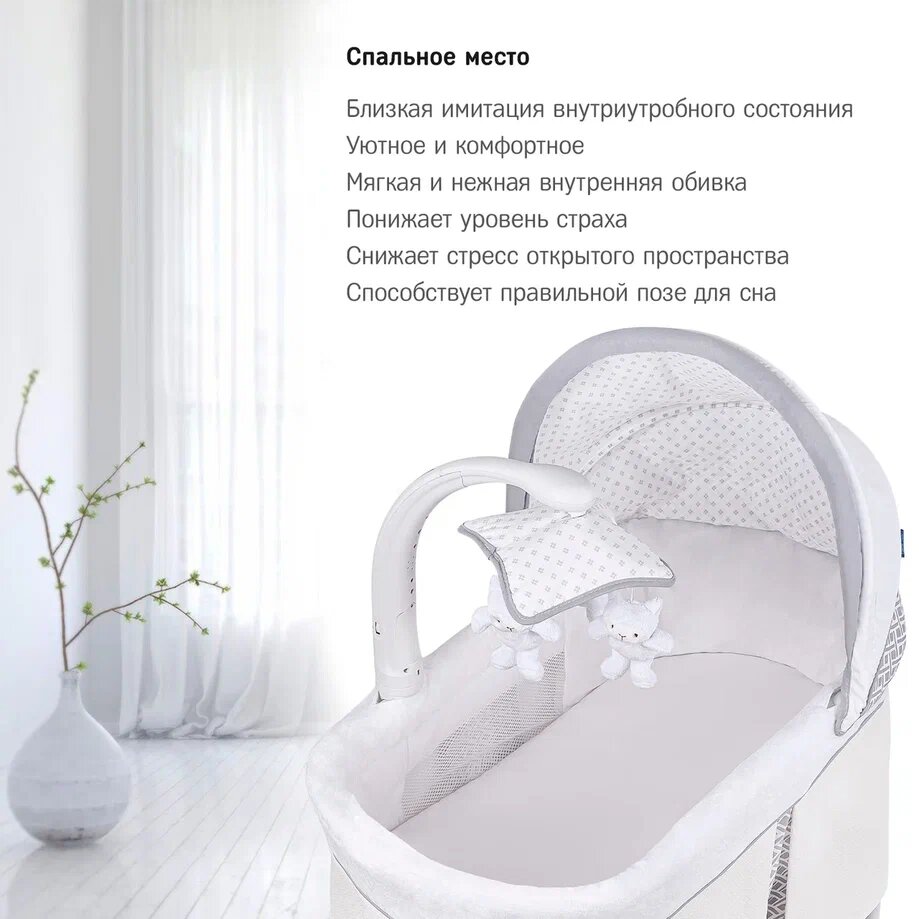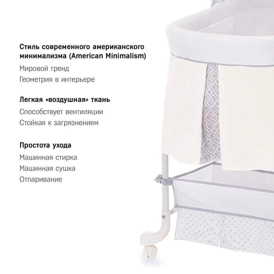 | Комплектация | колыбель / съёмный матрасик / наматрасник / капор / мобиль с игрушками / тканевая корзина для белья |