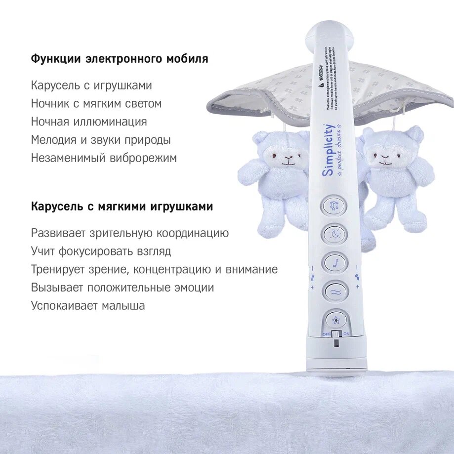 | Дополнительная информация | батарейки 3 х LR44 (тип C) - не входят в комплект; высота бортиков люльки 24 см; вес 6.5 кг |