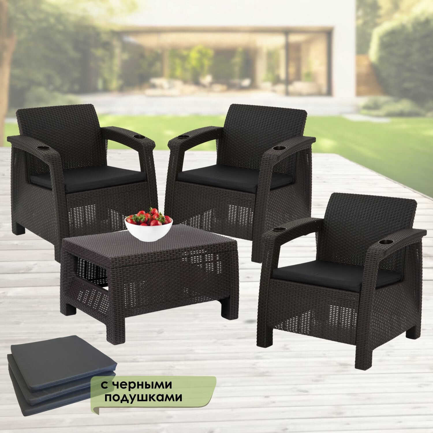 Комплект садовой мебели: Набор кофейный HomlyGreen на 3 персоны (3 кресла + кофейный столик), мокко, с черными подушками