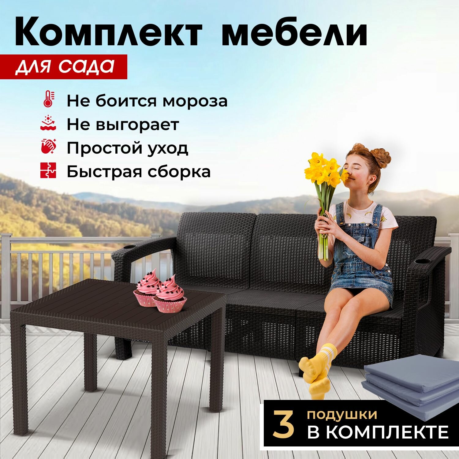 Комплект садовой мебели HomlyGreen (3-х местный диван + Стол 94х94х74см.), искуственный ротанг, мокко, коричневые подушки