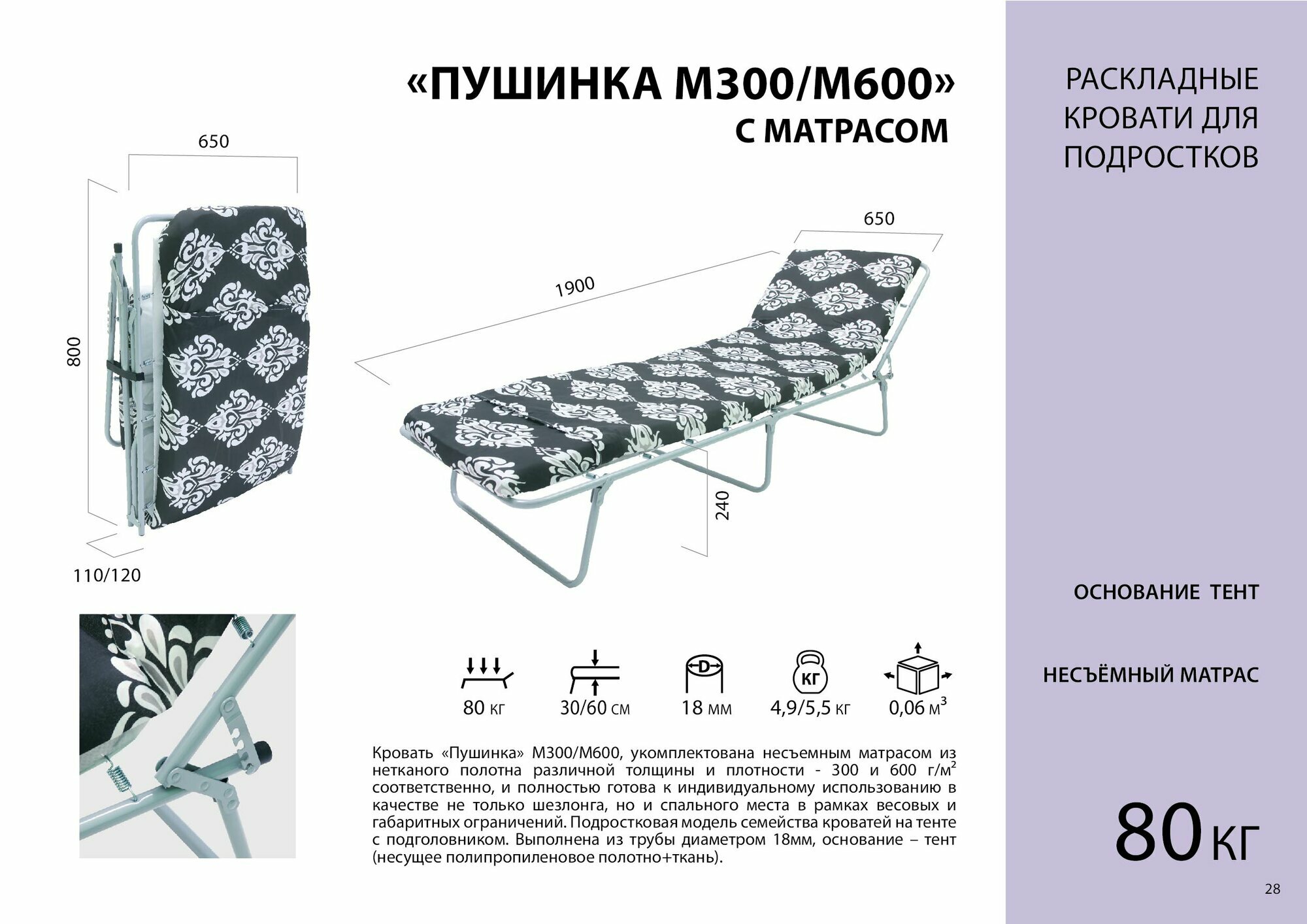Кровать раскладная (раскладушка) для детей и подростков "Пушинка М600" с подголовником с матрасом купить интересное: