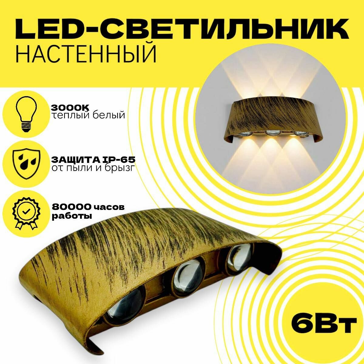 Светильник настенный светодиодный, 6Вт 3000К, бра уличный IP65 влагозащищенный, черный, интерьерный.
