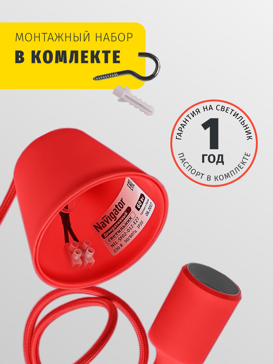 Купить Потолочный светильник Navigator 61 524 NIL-SF02 шнур с патроном, цоколь Е27, красный
