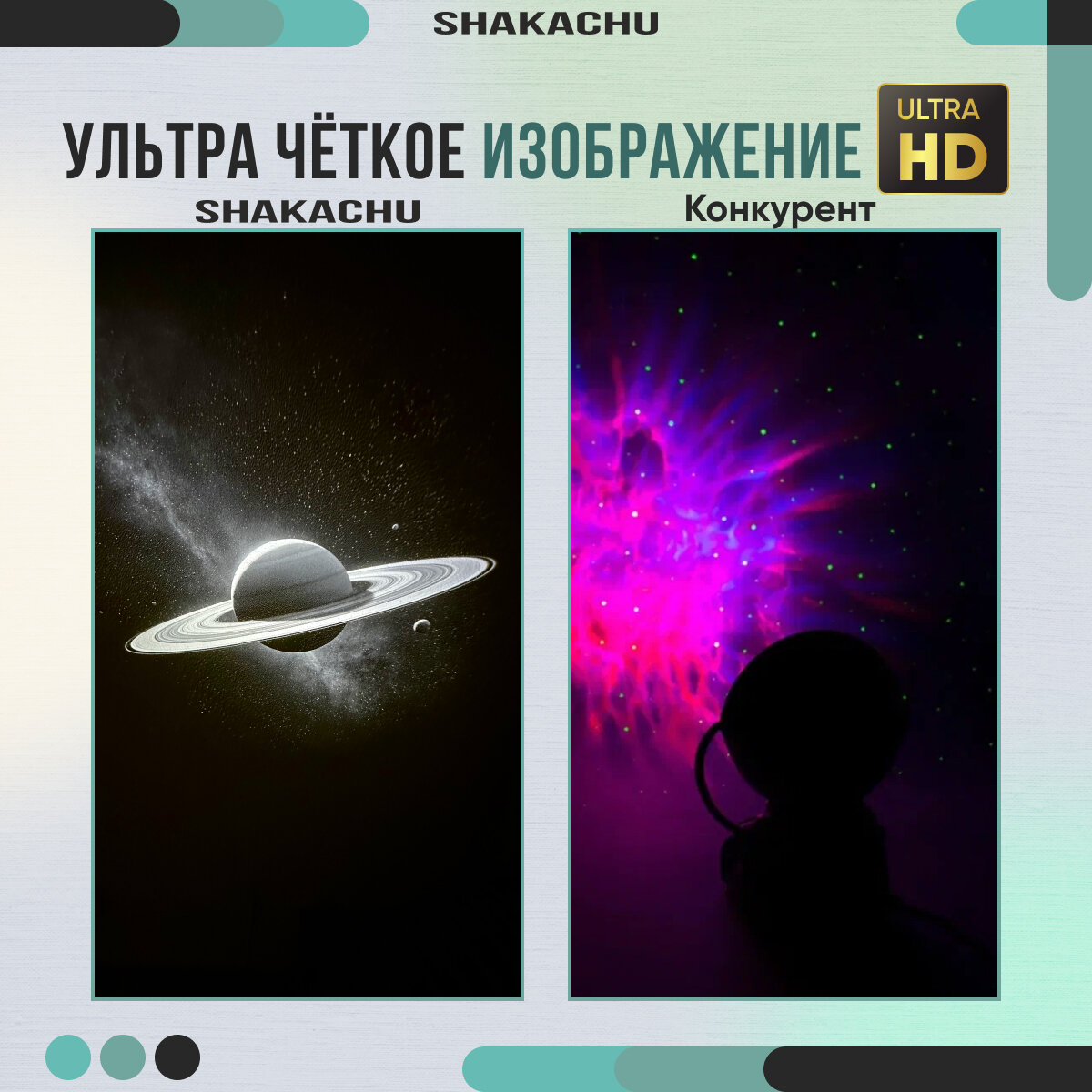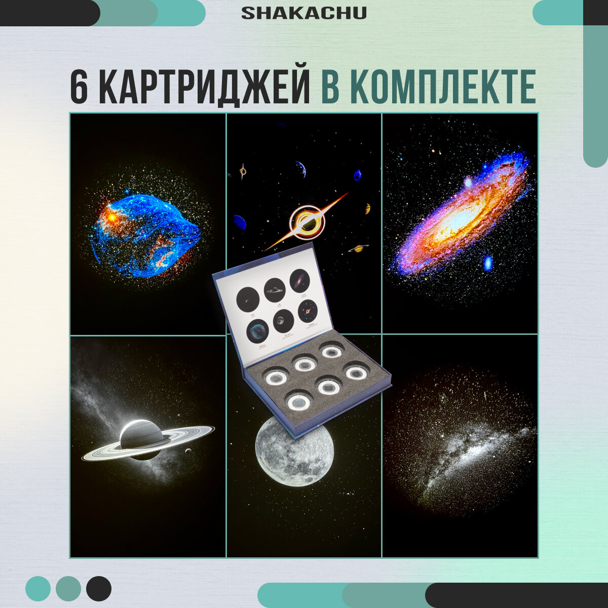 | Комплектация | 1)Планетарий Shakachu Vega BТ-360+подставка 2)15 кассет (GALAXY, SATURN, ANDROMEDA, DOLPHIN NEBULA, BRIGHT MOON IN THE SKY, THROUGH THE BLACK HOLE, BLUE LOVE, MOON RIVER, ROMANTIC FIREWORKS, EYE IN THE SKY, ENCOUNTER LIGHT, LONDGING FOR THE STARRY SKY, BEAUTIFUL AURORA, STAR RIVER, TIME ROSE) 3)Провод для зарядки 4)Салфетка 5)Инструкция |