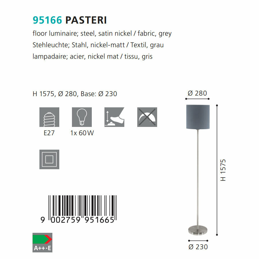 Торшер Eglo Pasteri 95166, E27, 60Вт, кол-во ламп:1шт., Серый