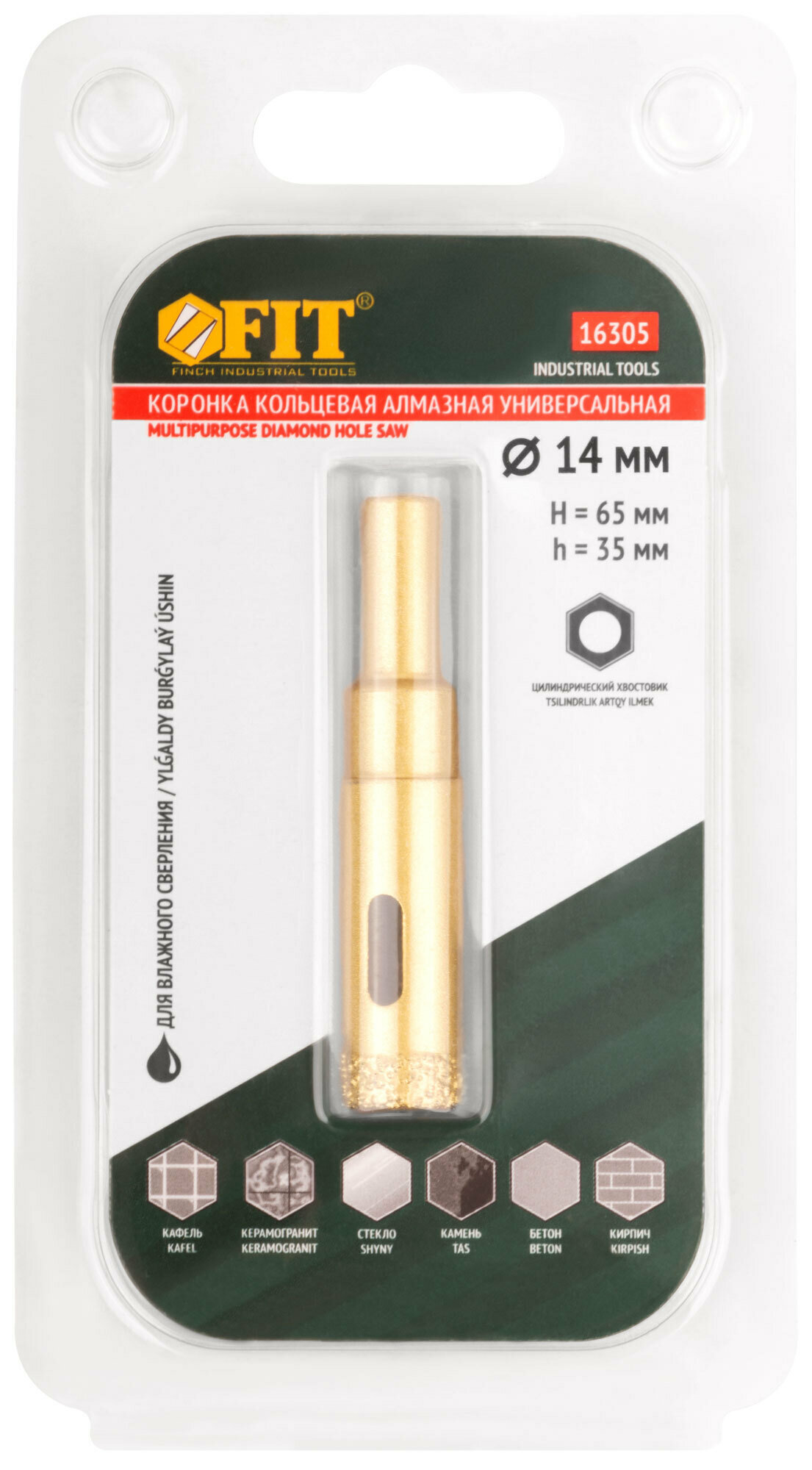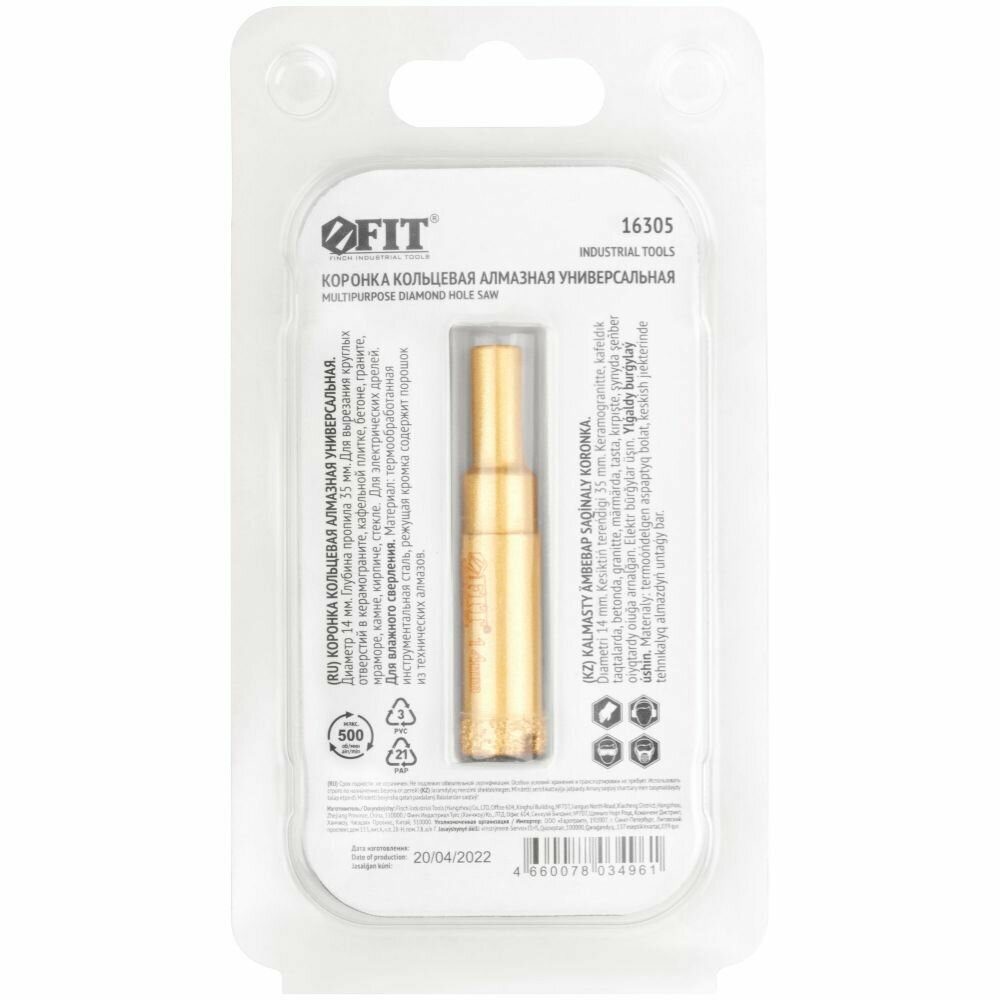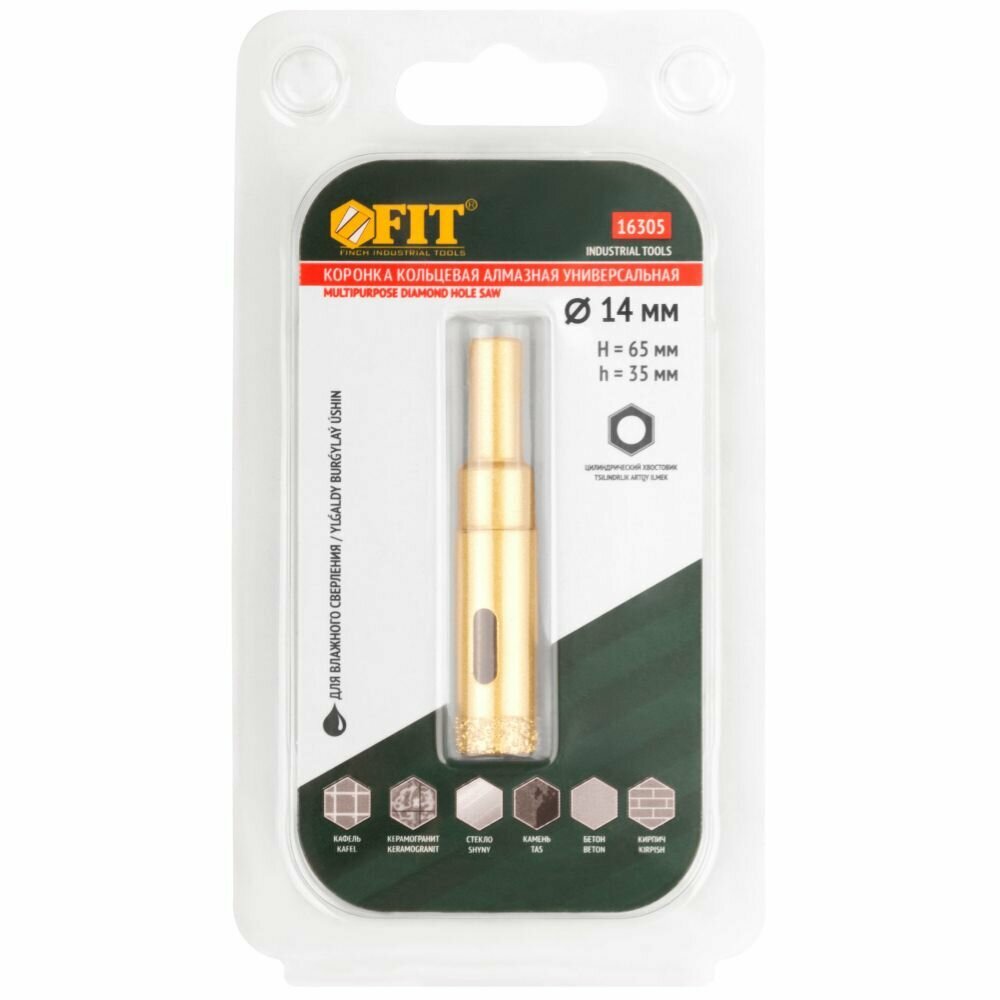 Купить Коронка кольцевая по керамограниту, камню, кафелю и стеклу алмазная, вакуумное спекание 14х65 мм FIT 16305