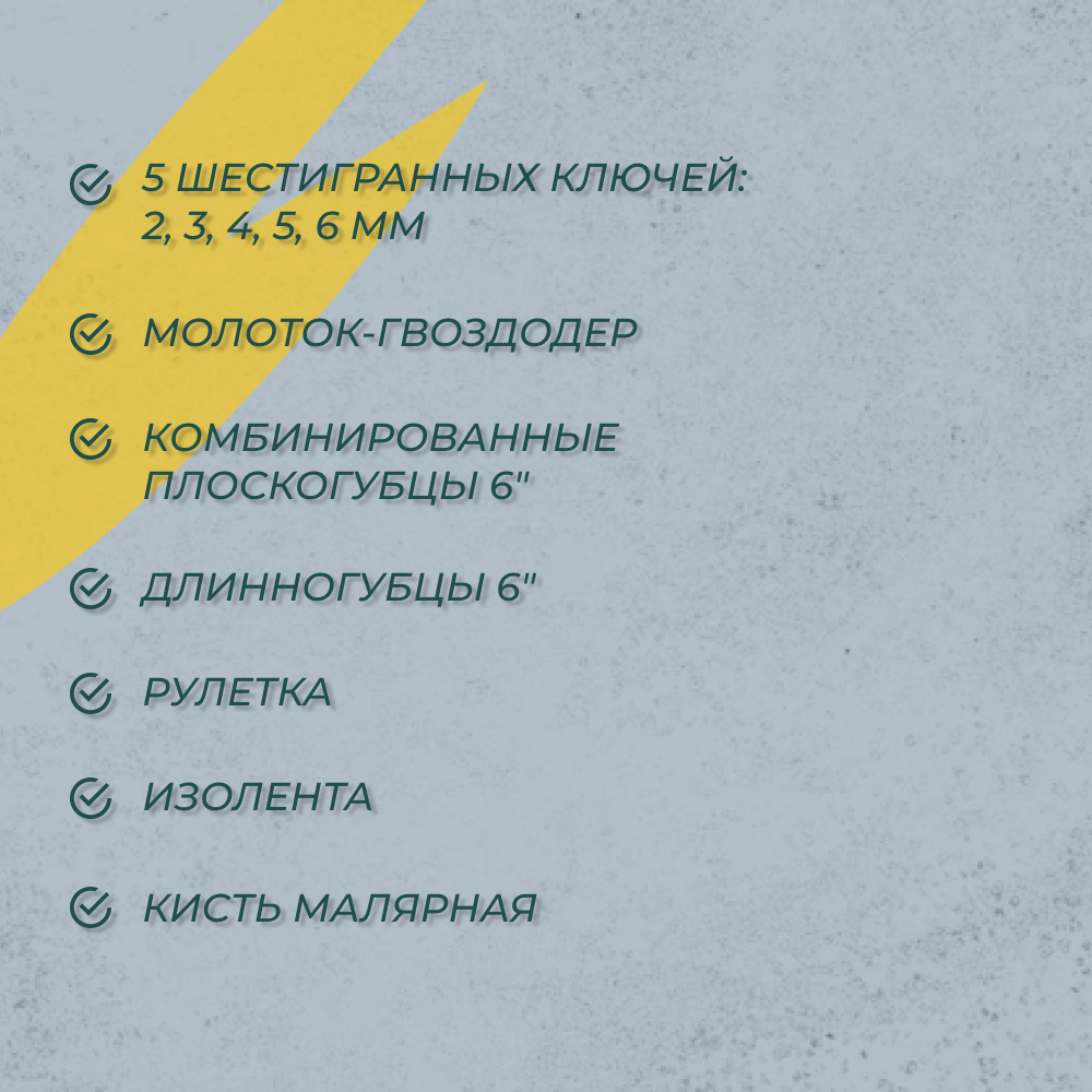 | Инструменты в комплекте | ключи имбусовые (шестигранные) / молоток / отвёртки / пассатижи / рукоять для бит |