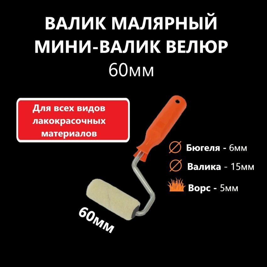 Валик малярный, мини-валик с ручкой, велюр 60 мм, диаметр 15 мм, ворс 5 мм, бюгель 6 мм, mini интересное: