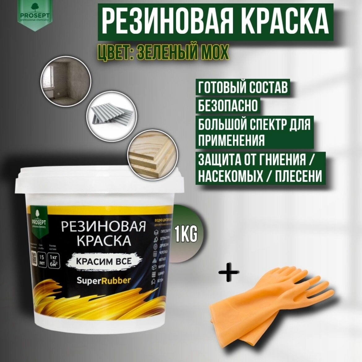 Краска резиновая PROSEPT SuperRubber зеленый мох Ral 6005 1 кг + перчатки для защиты рук