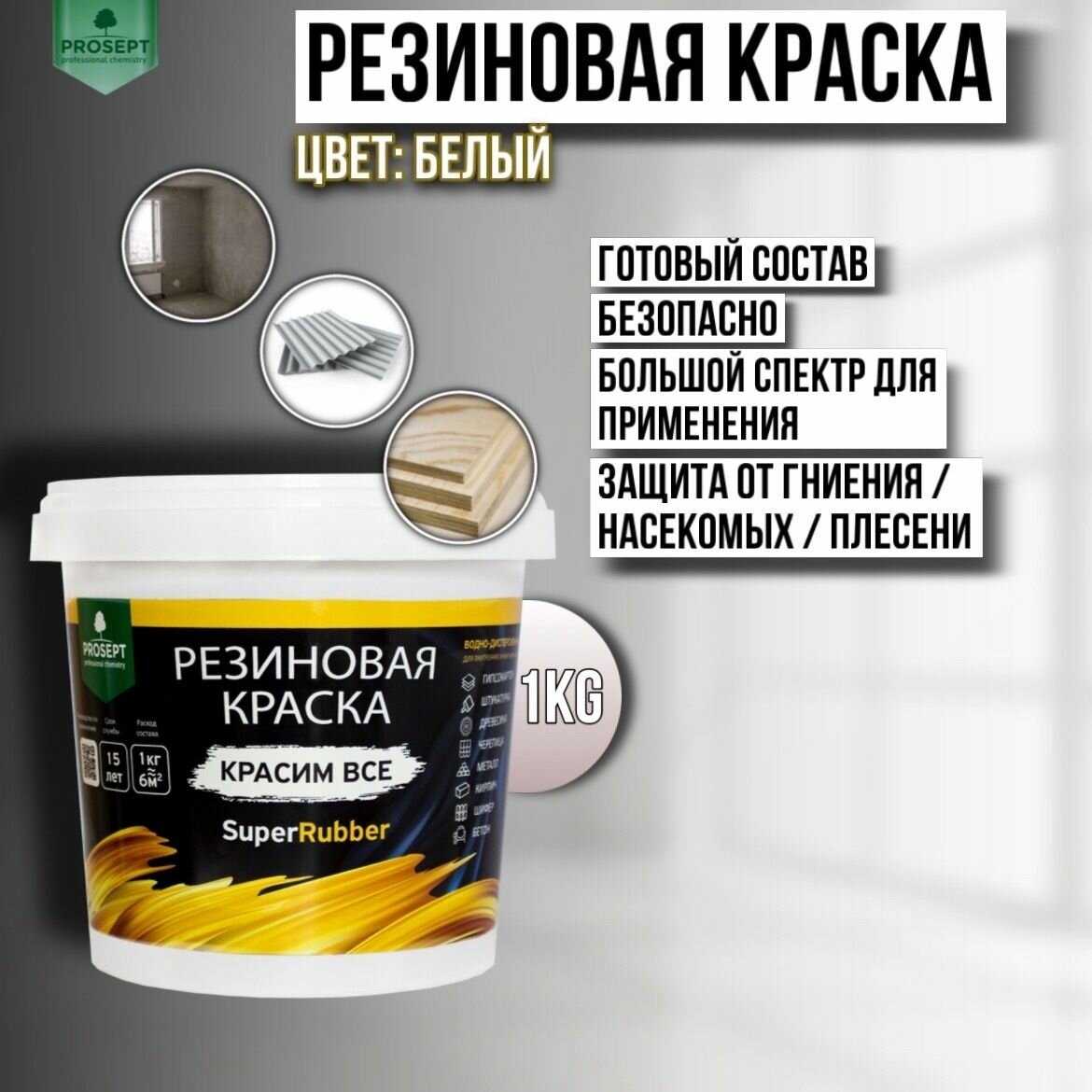 Краска для внутренних и наружных работ. Резиновая краска SuperRubber, RAL 9003 (белая), 1 кг. ( Prosept 069-1 )