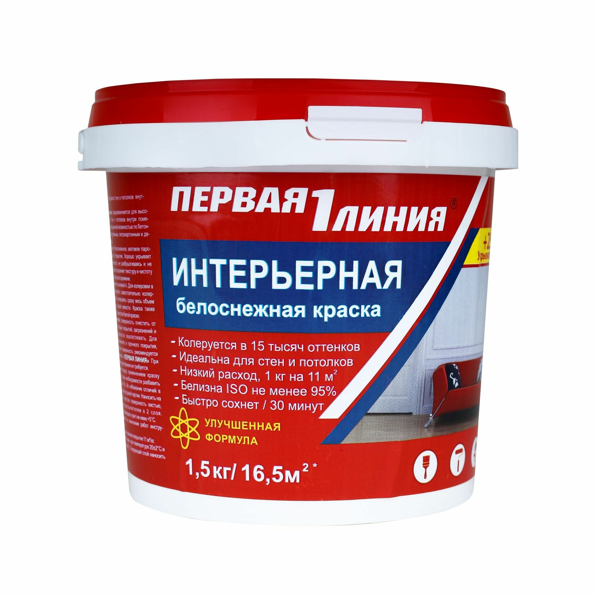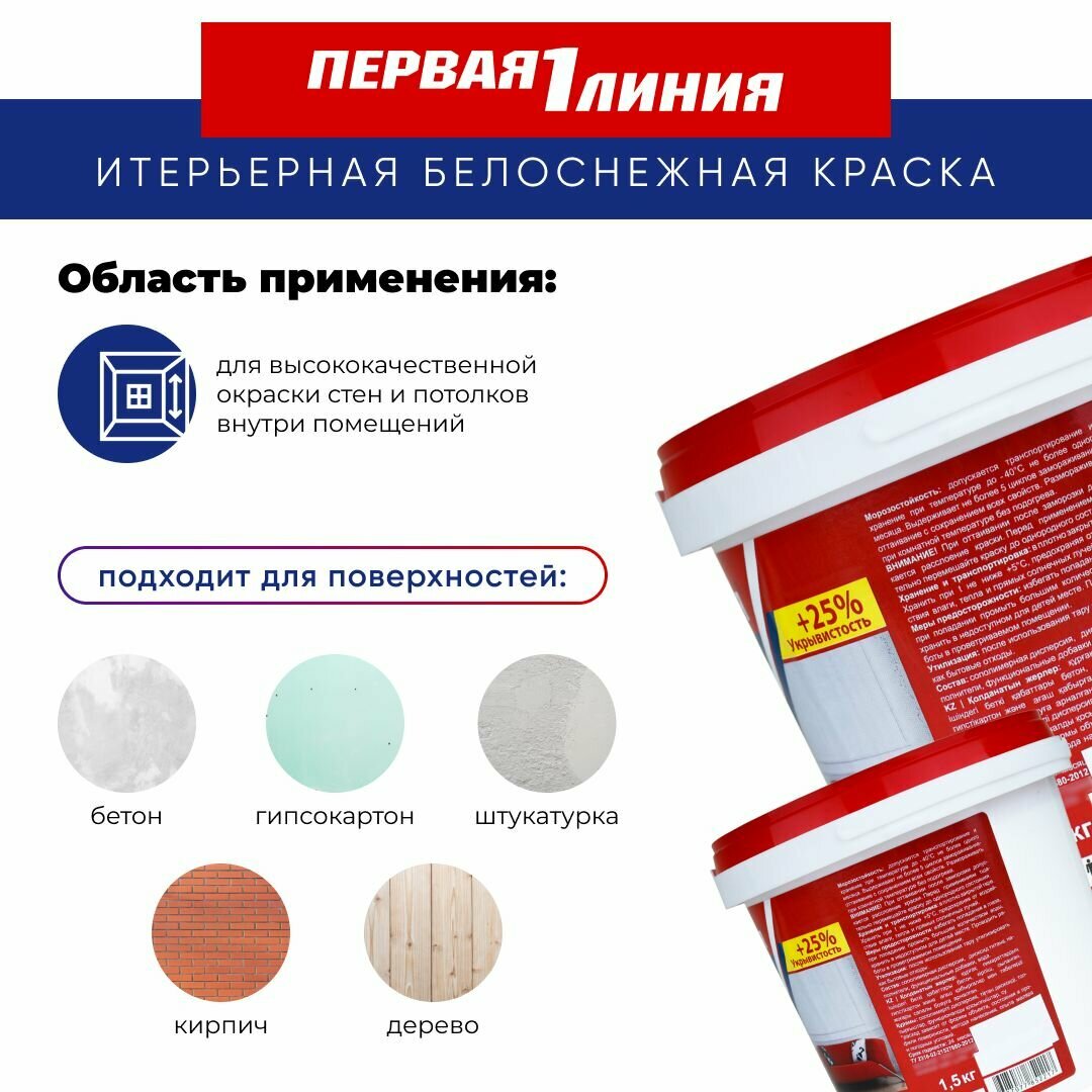 Купить Краска для стен и потолков Первая линия интерьерная, быстросохнущая, акриловая, белоснежная матовая 1,5 кг