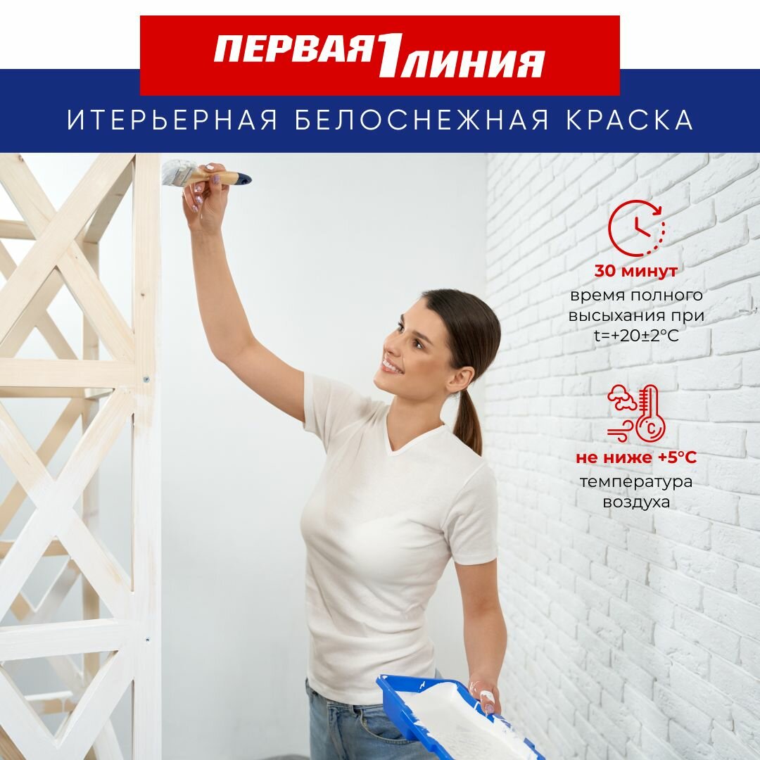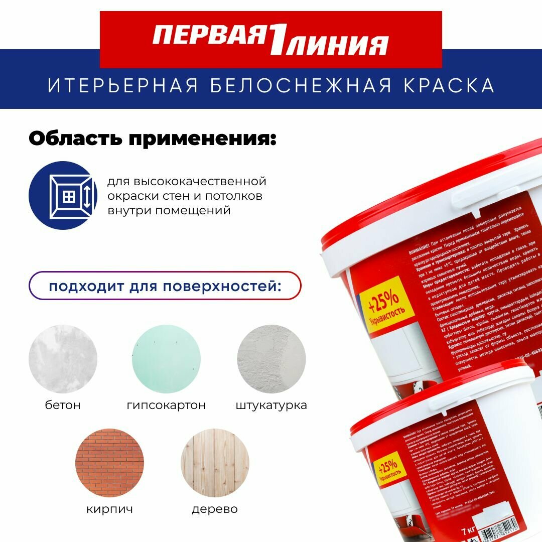 Краска для стен и потолков Первая линия интерьерная, быстросохнущая, акриловая, белоснежная 7 кг