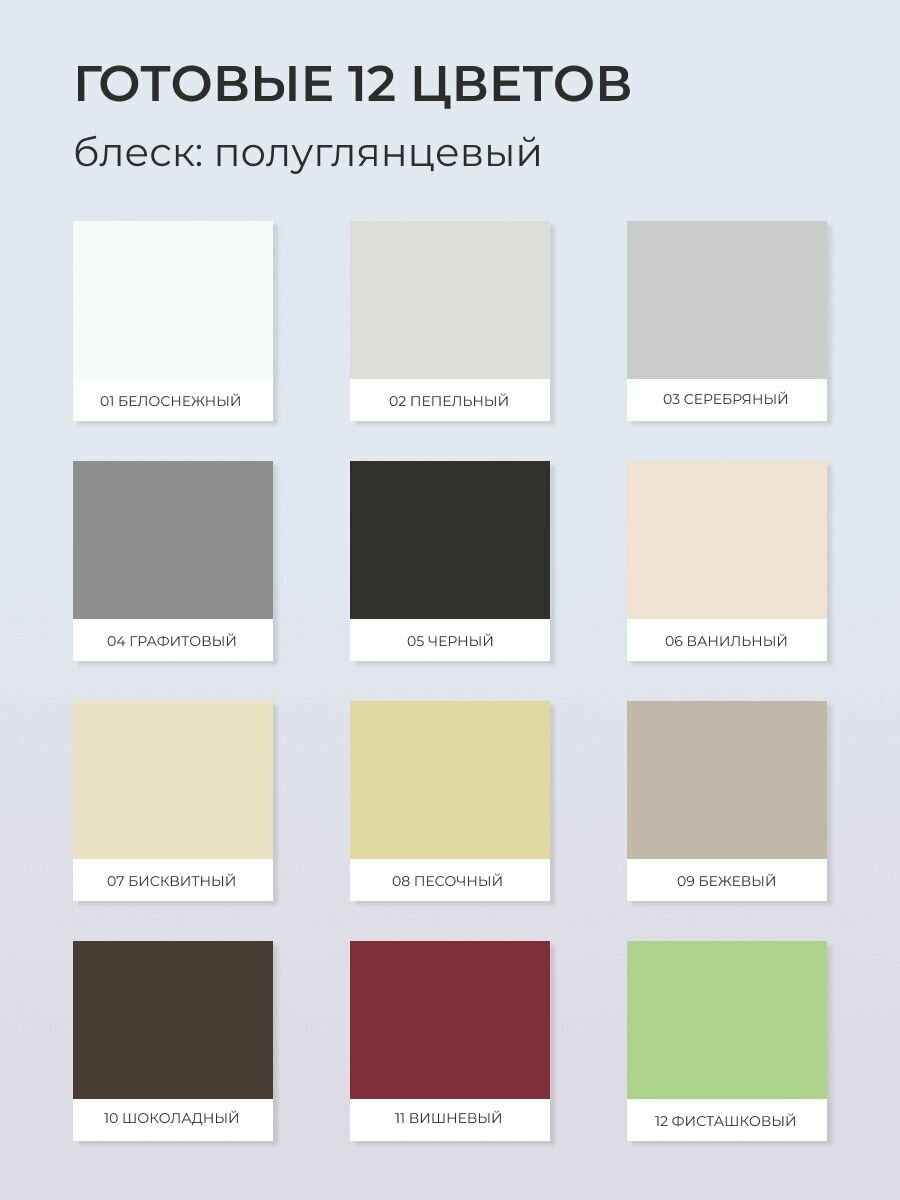 | Цвет товара | Шоколадный, бежевый, белоснежный, бисквитный, ванильный, вишнёвый, графит, пепельный, песочный, серебряный, фисташковый, черный |