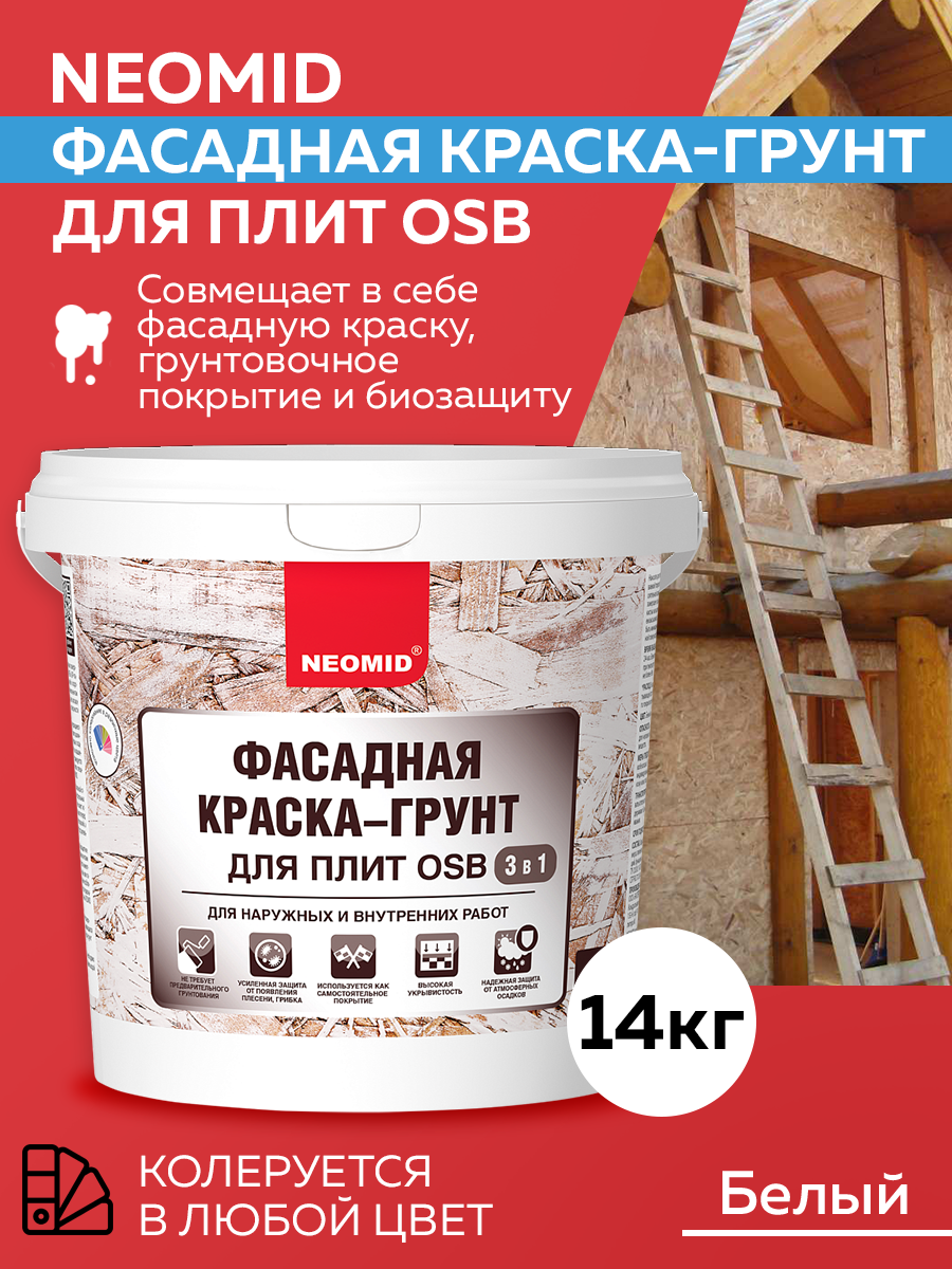 Краска-Грунт Фасадная для Плит OSB 3в1 Neomid 14кг Белая для Внутренних и Наружных Работ / Неомид.