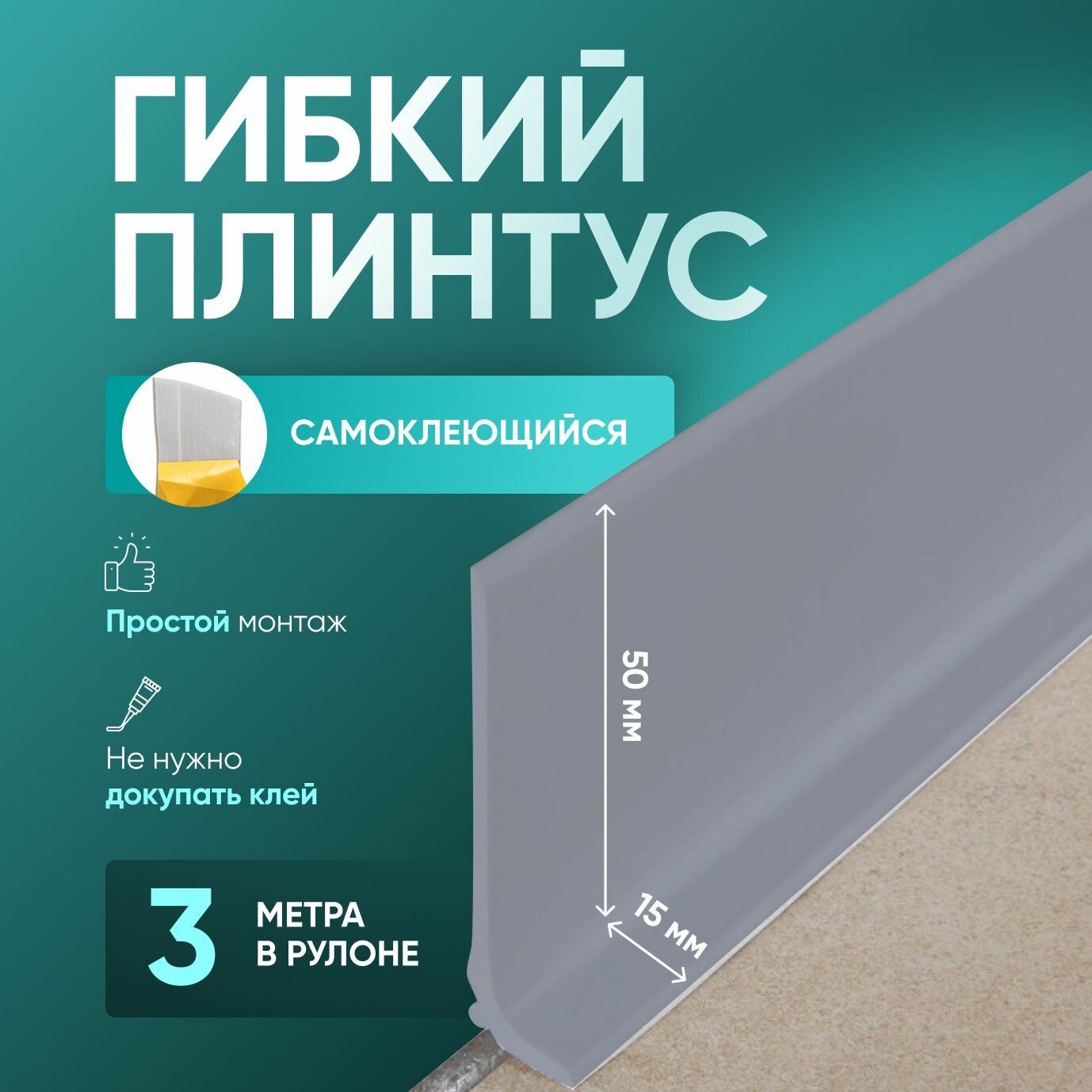 Плинтус гибкий напольный самоклеящийся, 3000х65 мм, 1 шт, серый