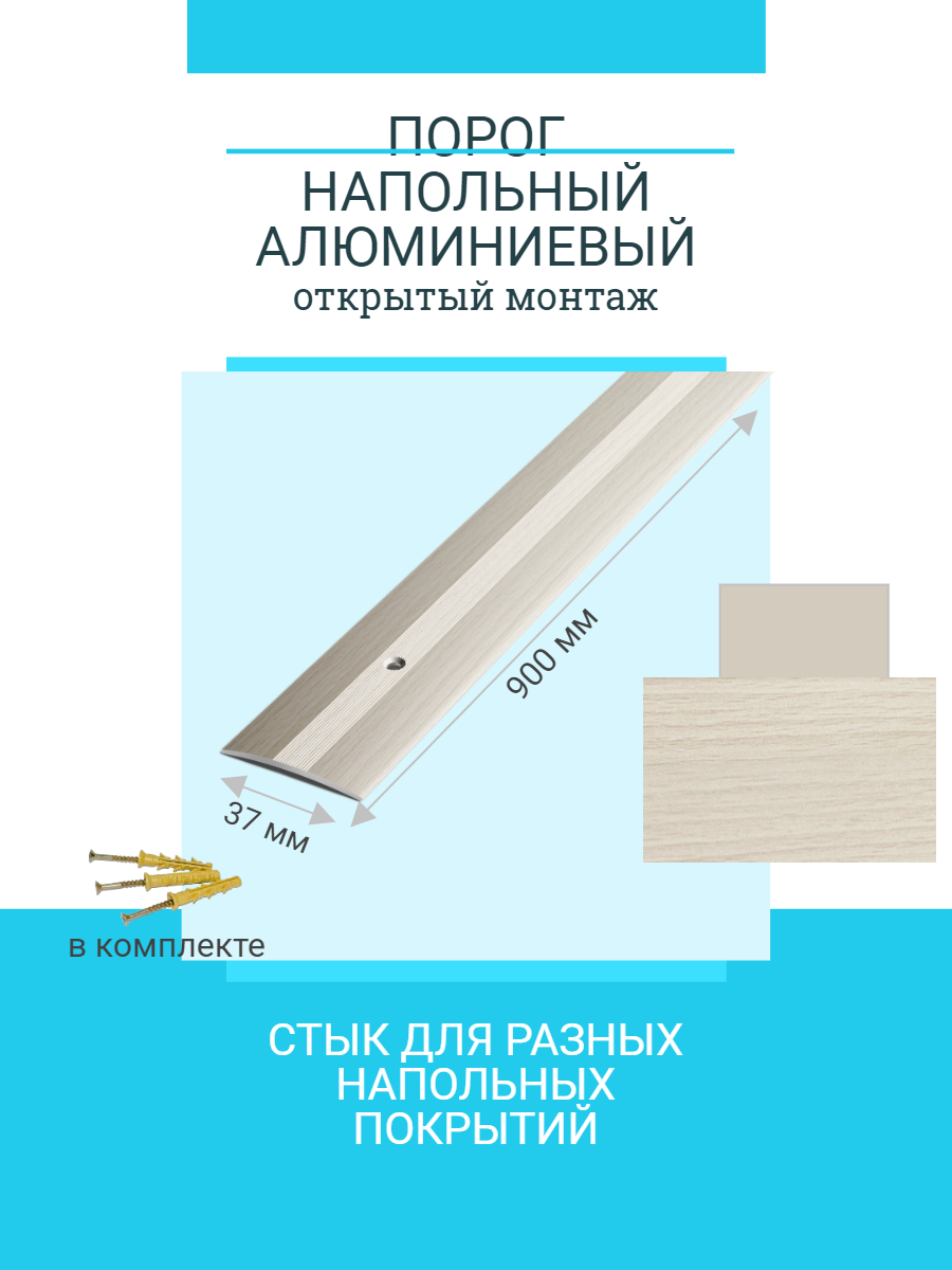 Порог напольный стыкоперекрывающий одноуровневый 37х3 мм, длина 0,9 м, профиль-порожек алюминиевый Лука ПС 03, анод серебро 01л