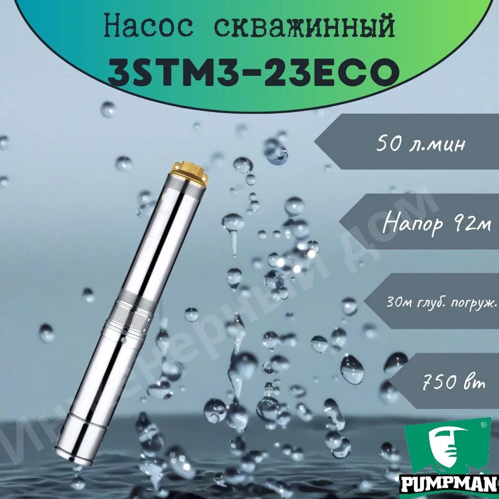 Насос PUMPMAN скважинный 3STM3-23ECO (750Вт, Hmax-92м, Qmax-3м3/ч, 50м кабель) PUMPMAN