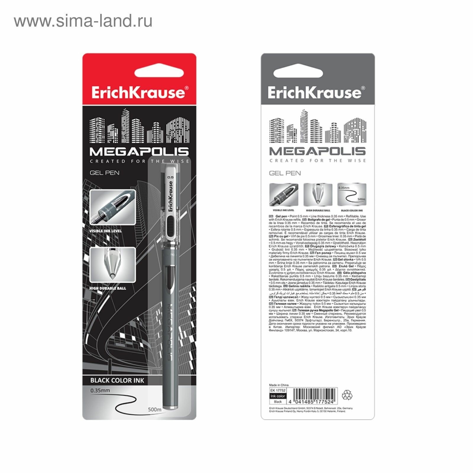 Ручка гелевая ErichKrause "MEGAPOLIS Gel" узел 0.5мм, чернила чёрные, в блистере 17752 3395630