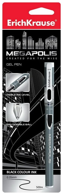 ErichKrause Ручка гелевая MEGAPOLIS Gel, узел 0.5 мм, чернила чёрные, длина линии письма 500 метров, в блистере