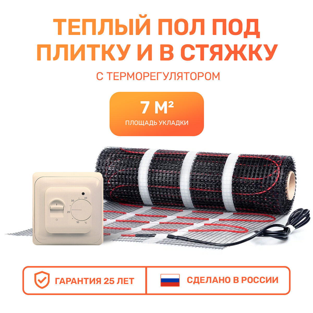 Купить Электрический теплый пол 7 м2 с механическим бежевым терморегулятором Тепло и Точка, 150 Вт/м2 двужильный экранированный нагревательный мат под плитку