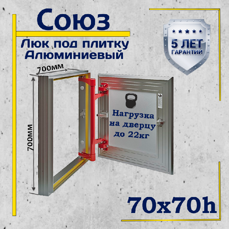 | Дополнительная информация | Люк модели «Союз» предназначен для скрытой ревизии инженерных коммуникаций и проемов с последующей облицовкой керамической плиткой. Люк открывается и закрывается легким нажатием на дверцу, благодаря стальному петлевому механизму, не прибегая к помощи дополнительных приспособлений. Жесткость алюминиевой конструкции «Союз» колоссально увеличивает ресурс изделия. Монтаж люка прост и не требует подрезки плитки в зоне люка, т.к. имеется возможность оклеивания дверцы отделочным материалом внахлест. Возможен монтаж люка в стены из гипоскартона, пеноблока, кирпича и тд. Комбинация особенностей конструкции (подшипники скольжения 3D регулировка) дают ряд преимуществ: Регулировка дверцы люка в 3-ех плоскостях; Высокая износостойкость; Уменьшение люфта; Плавность хода открывания/закрывания створки; Увеличенное количество циклов открываний/закрываний; |