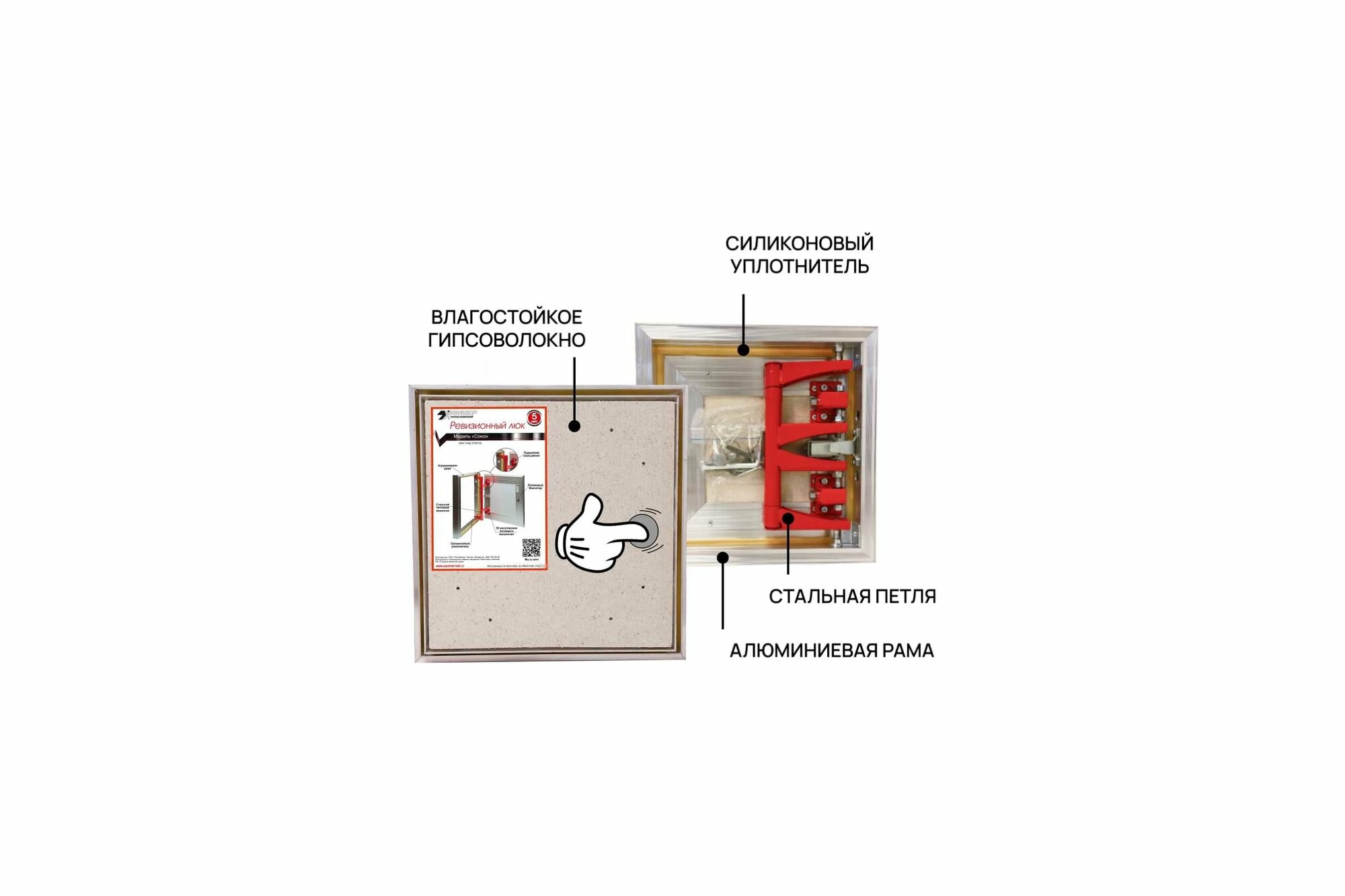 | Дополнительная информация | Люк модели «Союз» предназначен для скрытой ревизии инженерных коммуникаций и проемов с последующей облицовкой керамической плиткой. Люк открывается и закрывается легким нажатием на дверцу, благодаря стальному петлевому механизму, не прибегая к помощи дополнительных приспособлений. Жесткость алюминиевой конструкции «Союз» колоссально увеличивает ресурс изделия. Монтаж люка прост и не требует подрезки плитки в зоне люка, т.к. имеется возможность оклеивания дверцы отделочным материалом внахлест. Возможен монтаж люка в стены из гипоскартона, пеноблока, кирпича и тд. Комбинация особенностей конструкции (подшипники скольжения 3D регулировка) дают ряд преимуществ: Регулировка дверцы люка в 3-ех плоскостях; Высокая износостойкость; Уменьшение люфта; Плавность хода открывания/закрывания створки; Увеличенное количество циклов открываний/закрываний; |