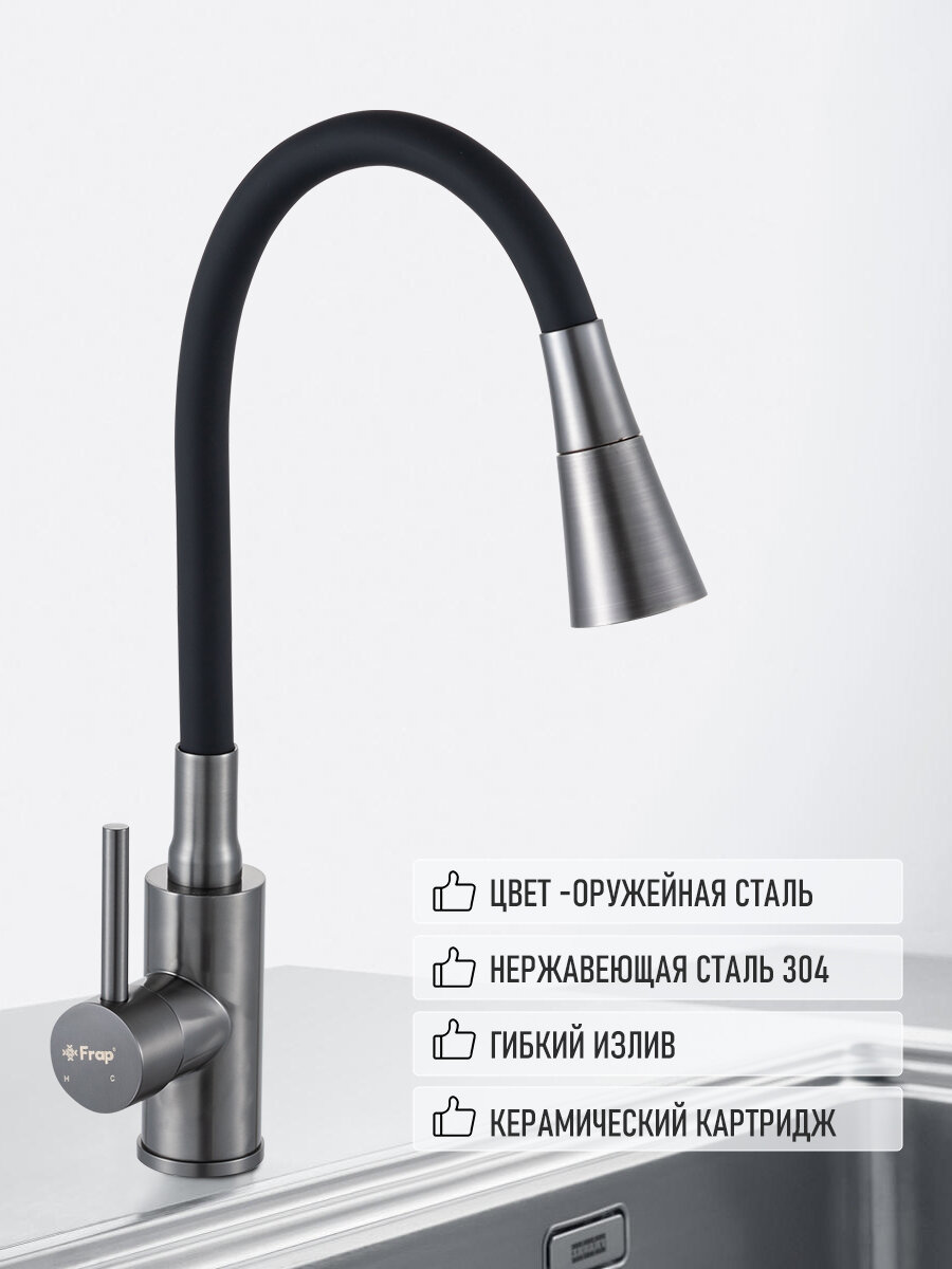 Смеситель для кухни с гибким изливом кран на кухню Frap оружейная сталь