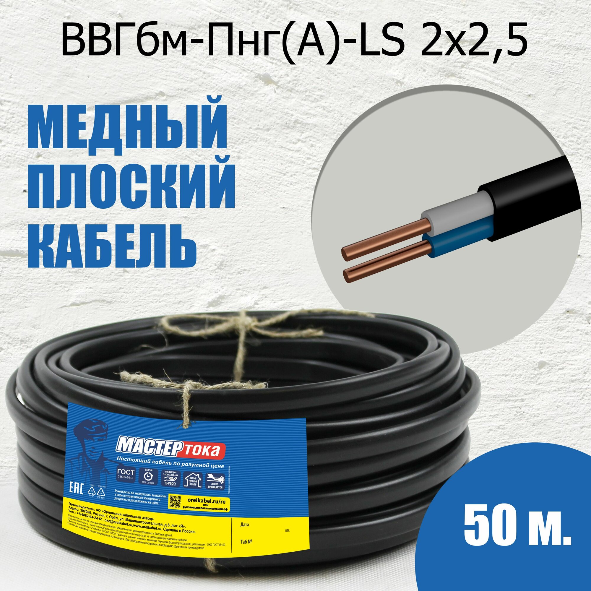 Купить Кабель бытовой монтажный ВВГ-Пнг(A)-LS 2х2.5 50 метров Мастер Тока